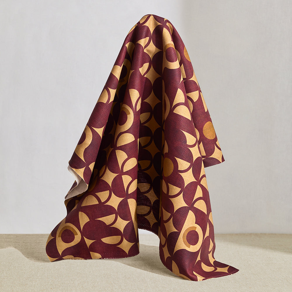 Curvilinear art deco inspired pattern in rust red, ochre and ecru.