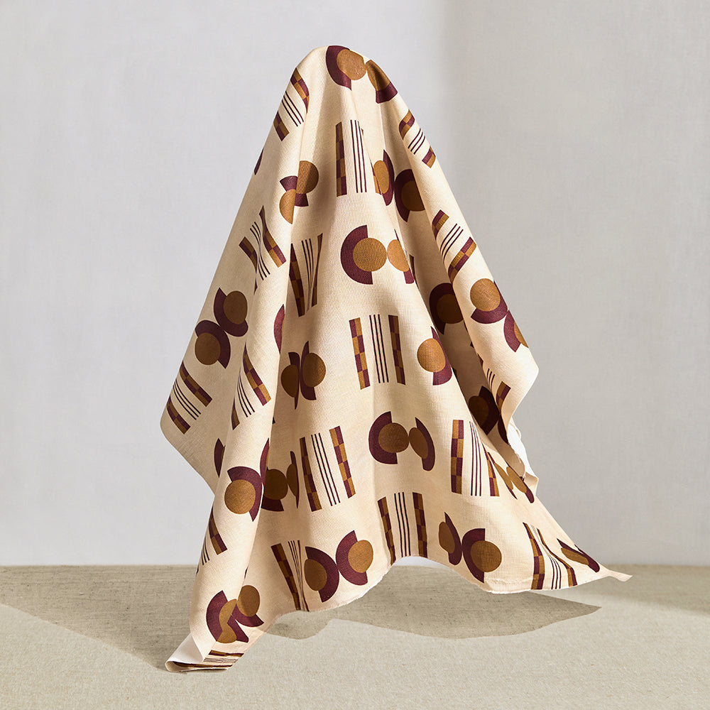 Hanging fabric in a graphic geometric pattern of circles and stripes in maroon and ochre on a cream field.