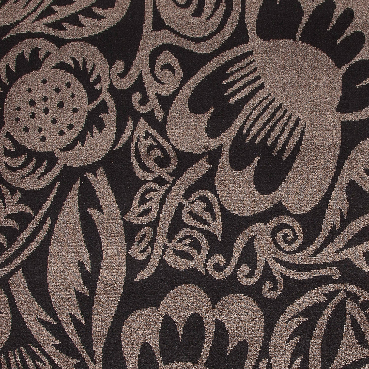 Wool-silk broadloom carpet swatch in a floral paisley pattern in mauve on a dark brown field.