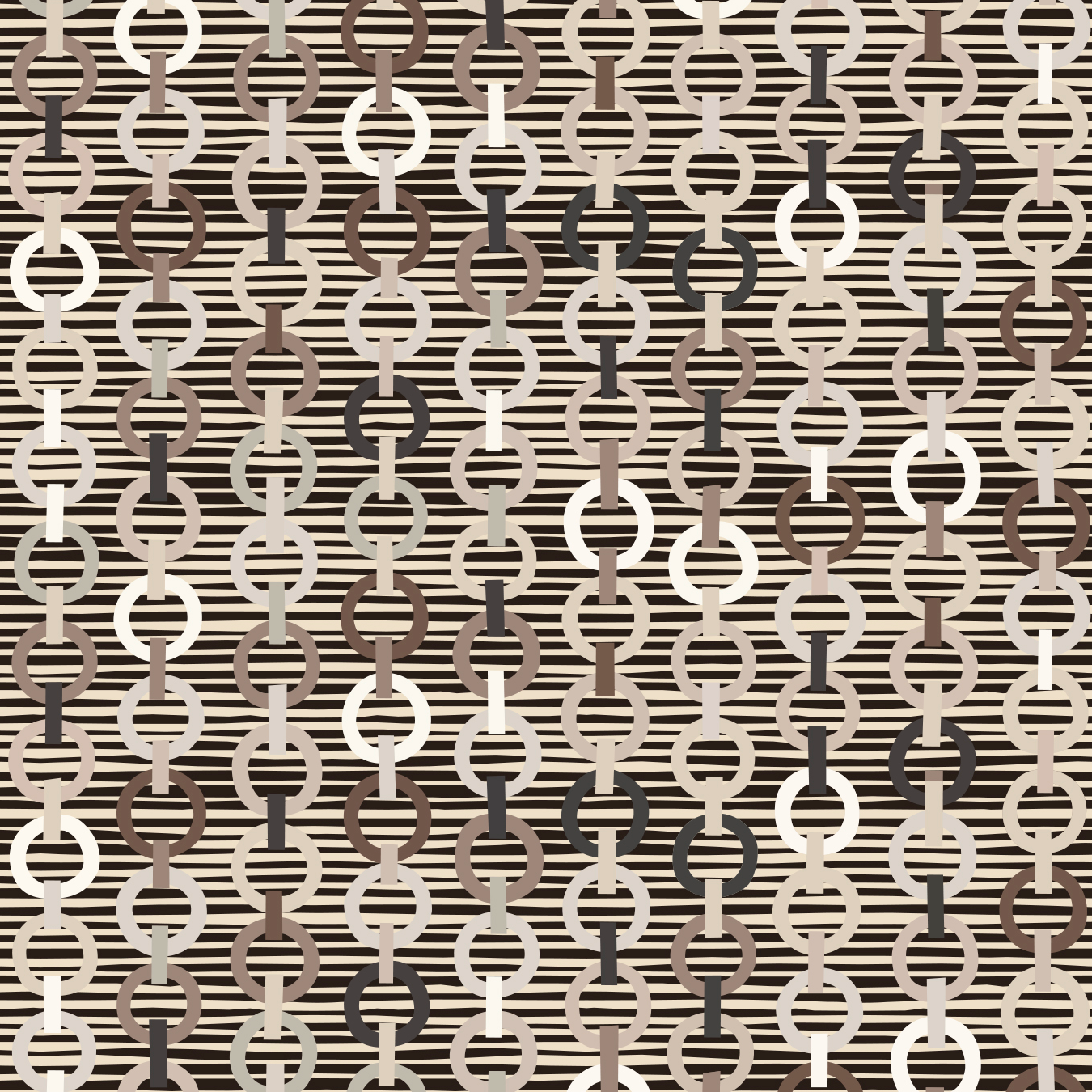 Detail of wallpaper in a playful paper chain stripe print in shades of cream, brown and black.