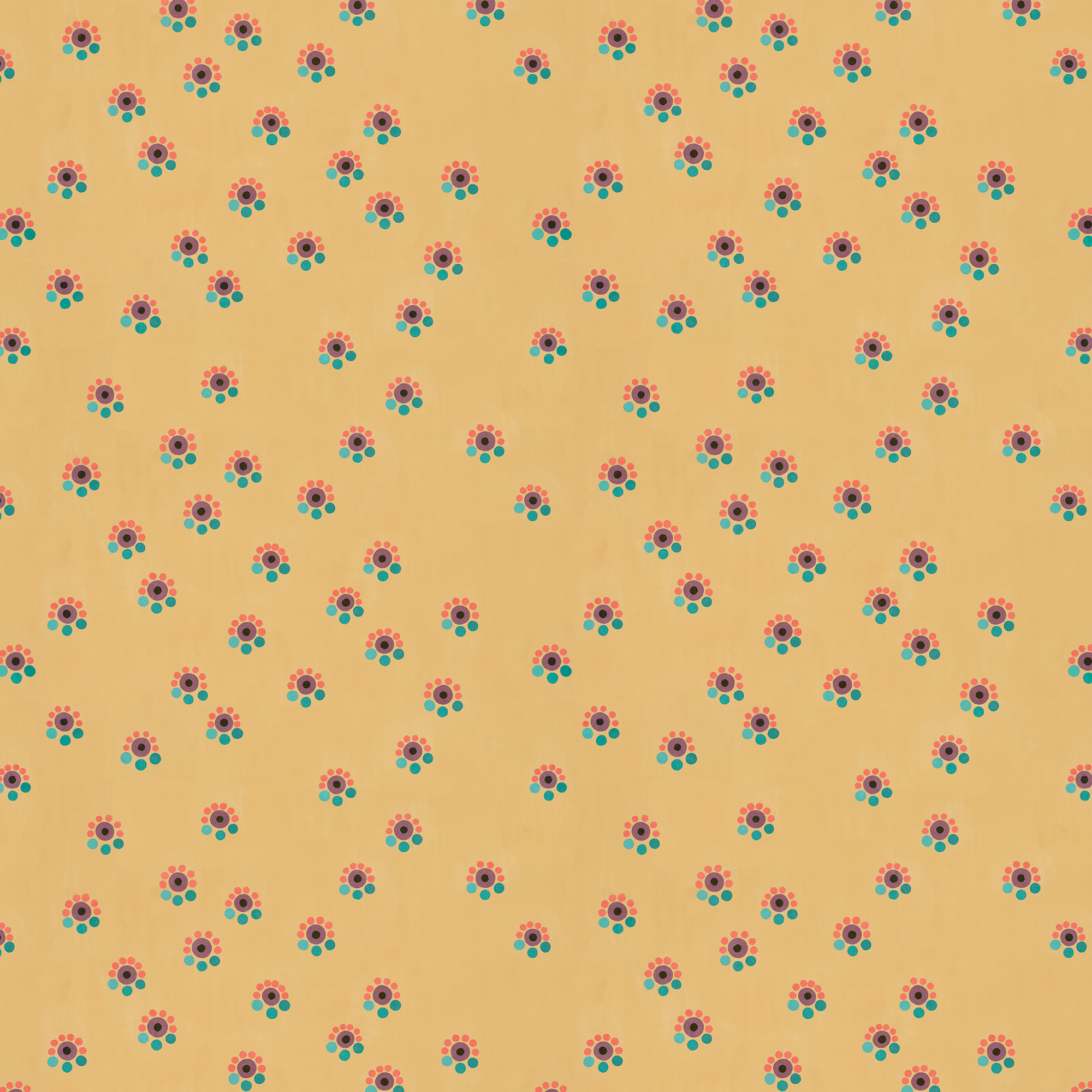 Detail of wallpaper in a minimal floral print in shades of pink, gold and green on a cream field.