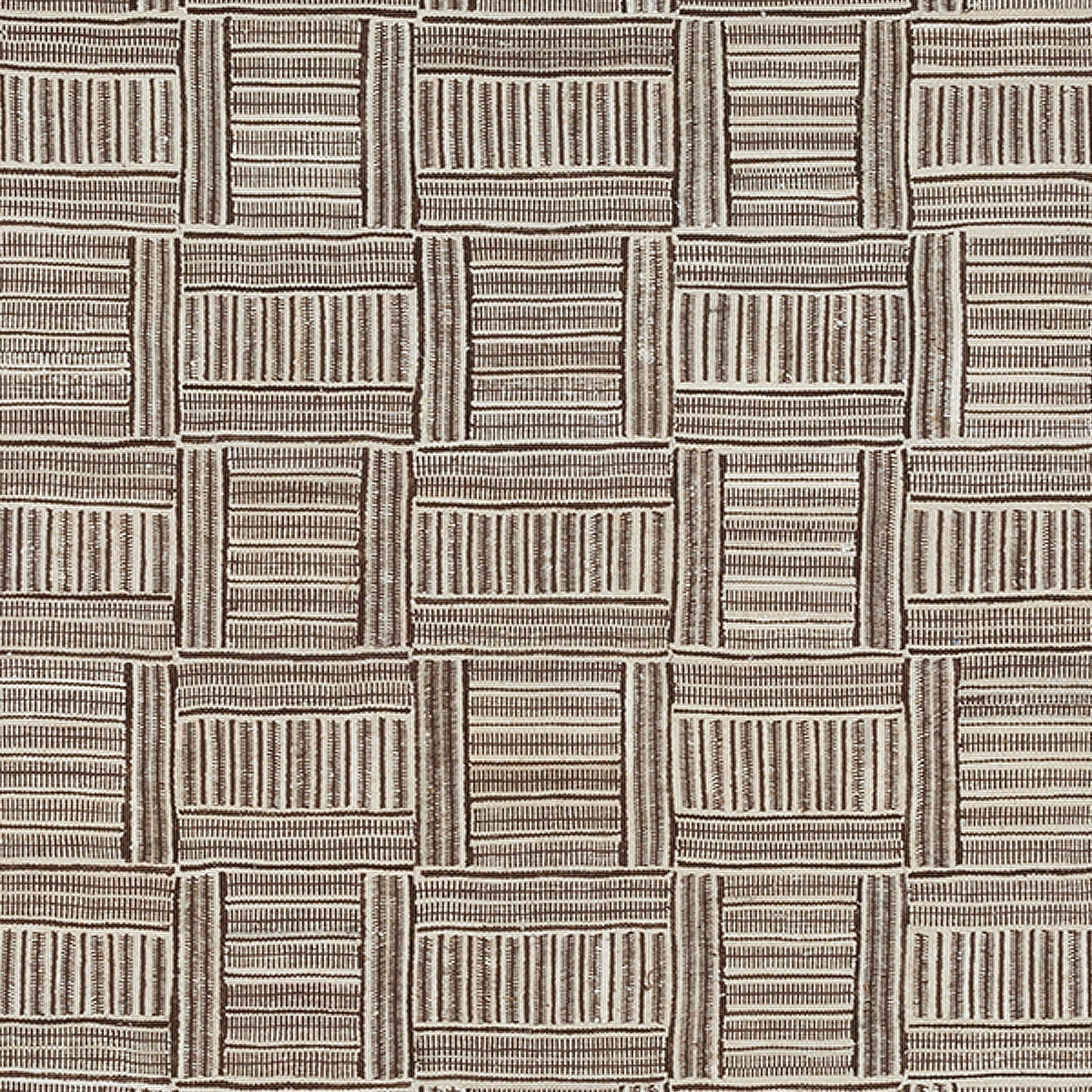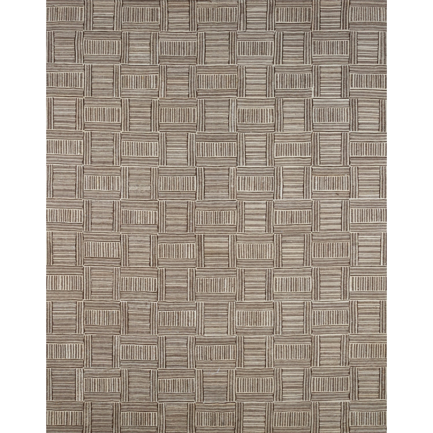 Woven rug swatch in a basket-weave pattern of alternating horizontal and vertical stripes in brown on a cream field.