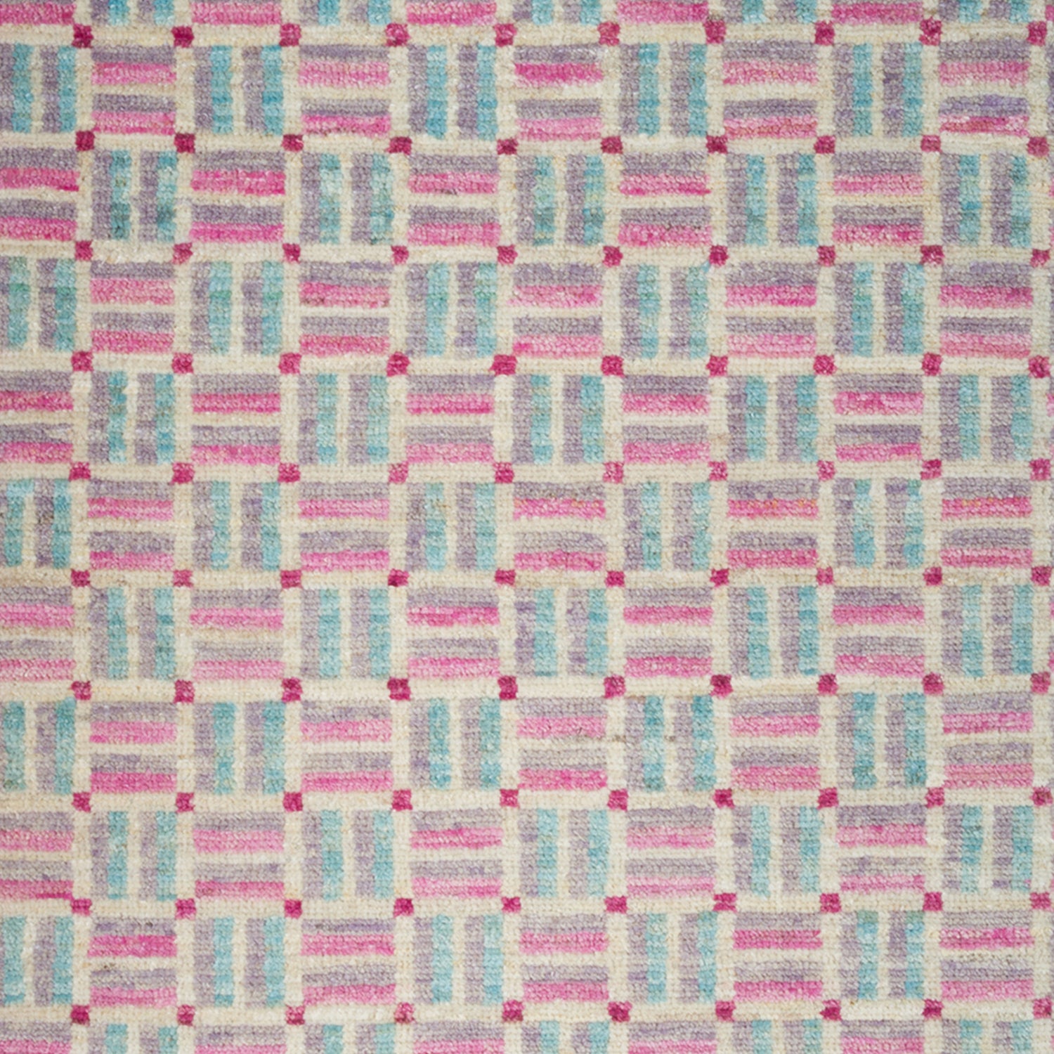 Woven high-pile rug swatch in a small-scale square crosshatch design in shades of pink, blue and cream.
