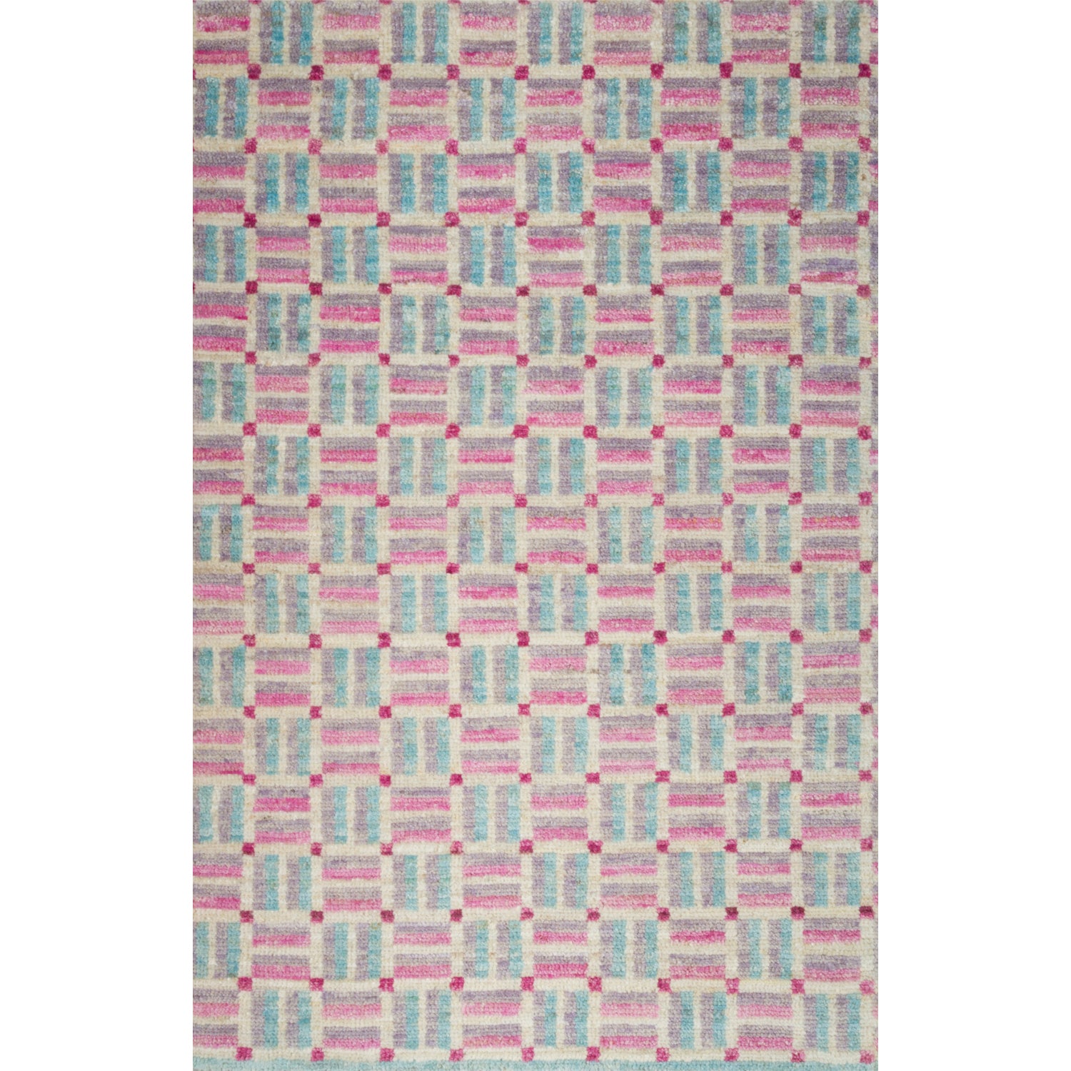Rectangular high-pile rug in a small-scale square crosshatch design in shades of pink, blue and cream.