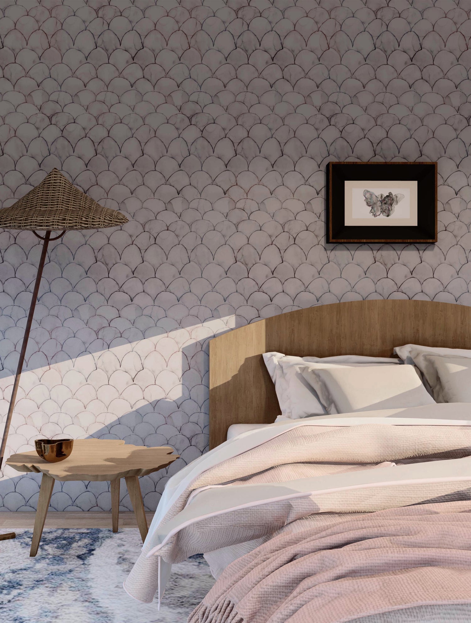 Detail of wallpaper in a watercolor linear scallop pattern in purple on a lilac field.