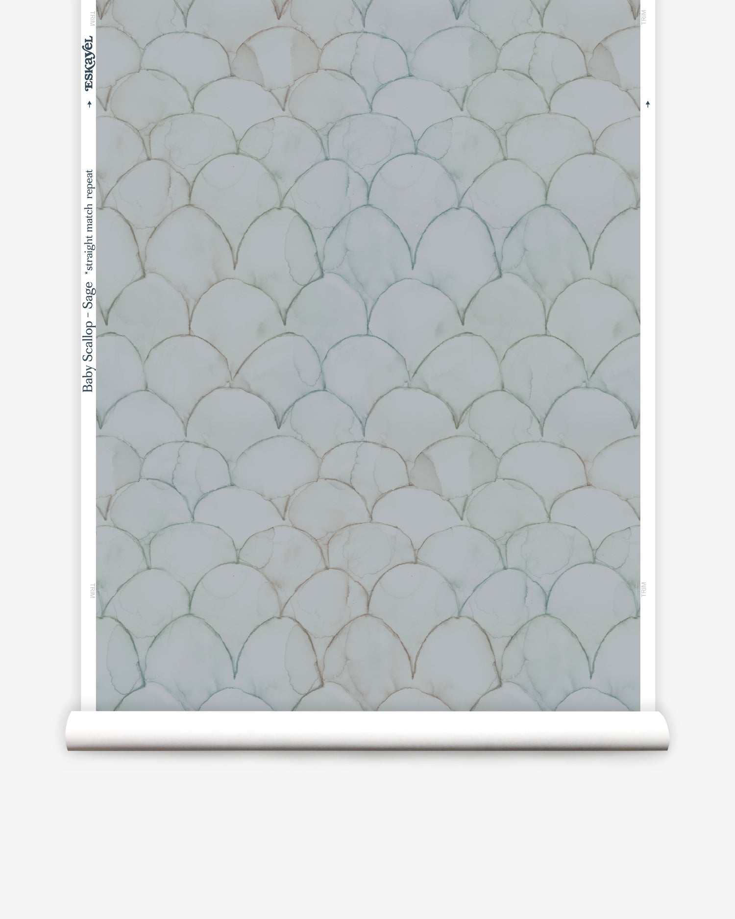 Wallpaper roll in a watercolor linear scallop pattern in green on a sage field.