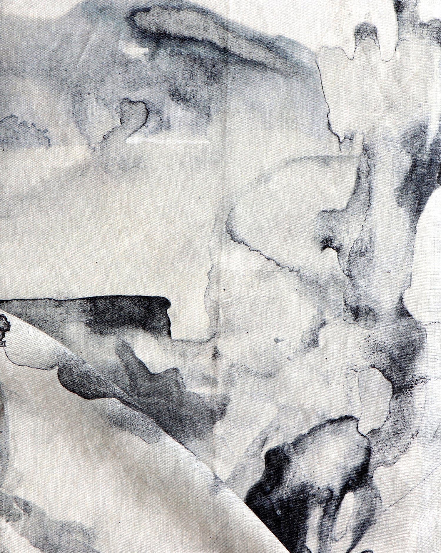 Detail of draped fabric in a watercolor painterly print in shades of gray and white.