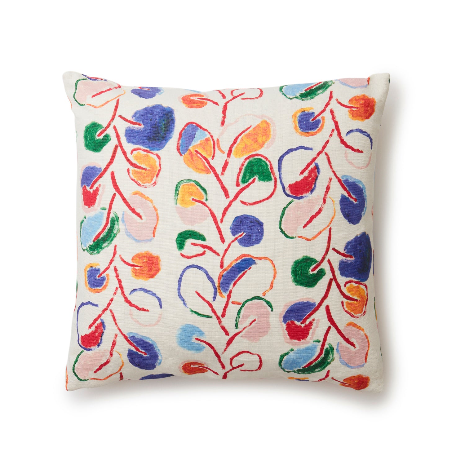 A square throw pillow with repeating rows of colorful leaf prints in shades of red, purple and blue on a cream background.