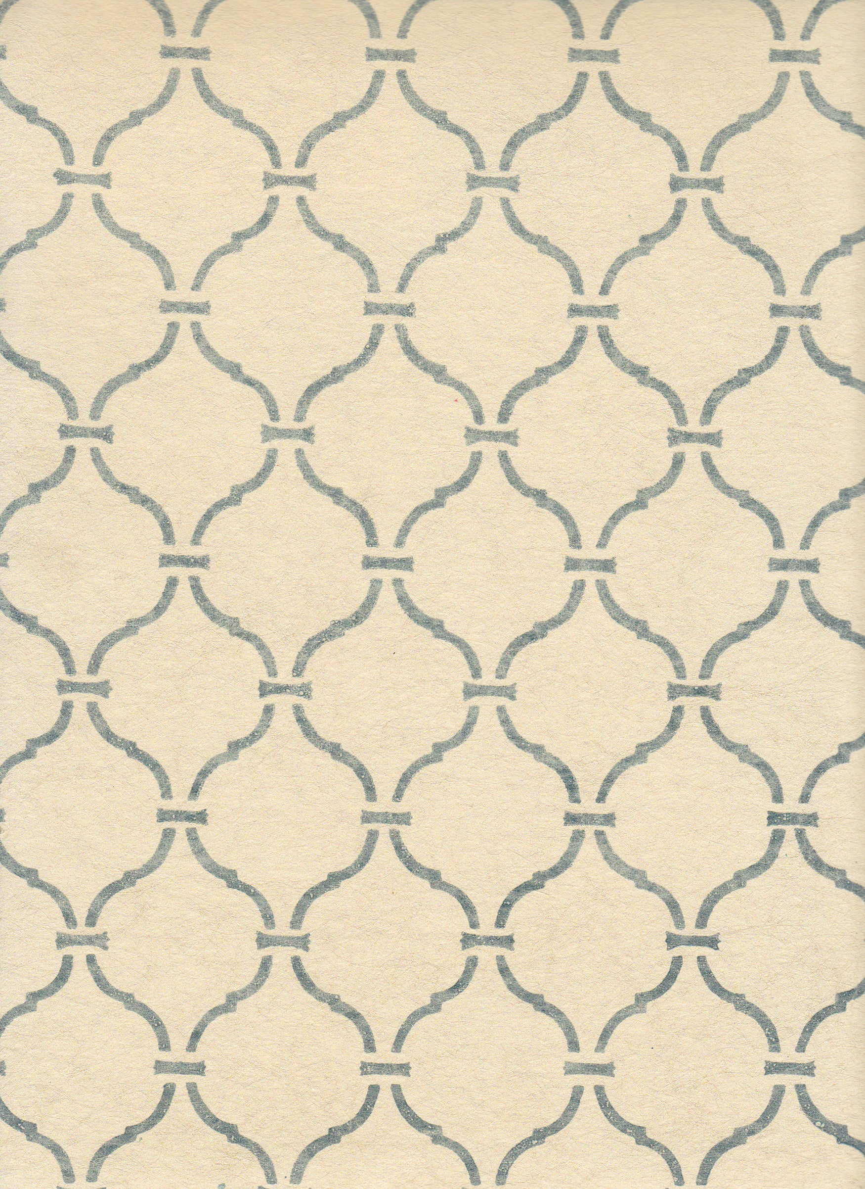 Detail of wallpaper in a curvilinear lattice print in blue-gray on a cream field.