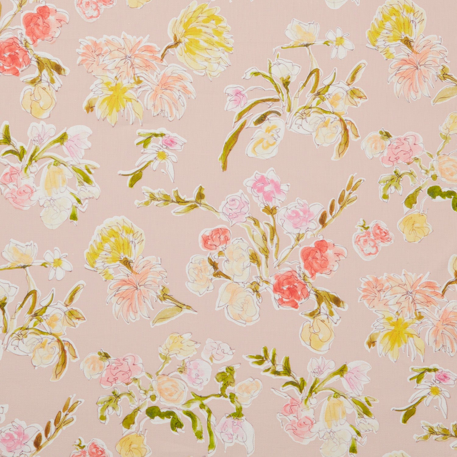 Linen swatch with a pattern of large-scale line-drawn flowers in gray ink with red, pink and yellow watercolors, on a pink background.