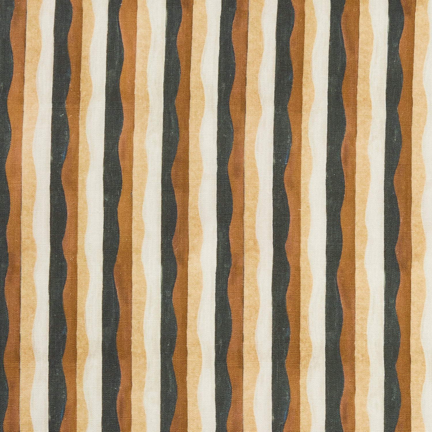 Woven fabric swatch in a curvy hand-painted stripe pattern in shades of brown, tan and white.