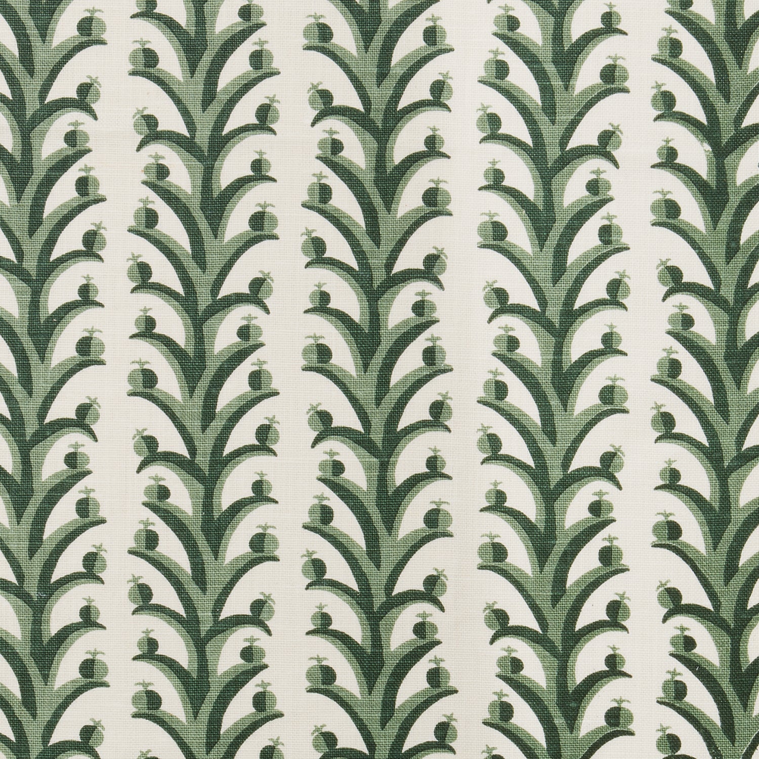 Fabric swatch with a horizontal striped pattern of curved branches topped with tiny fruits, in shades of cream and green.