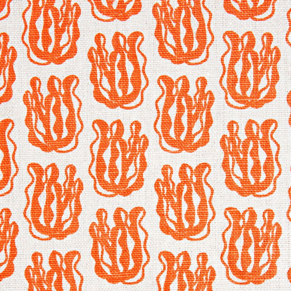 Woven fabric swatch with a repeating cartoon seaweed print in orange on a white background.