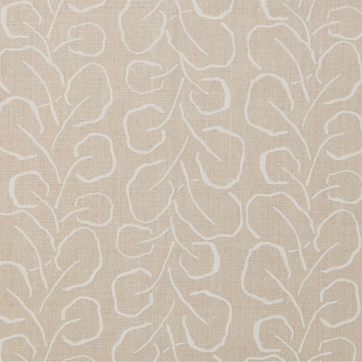 Woven fabric swatch with a large-scale repeating leaf print in white on a cream background.