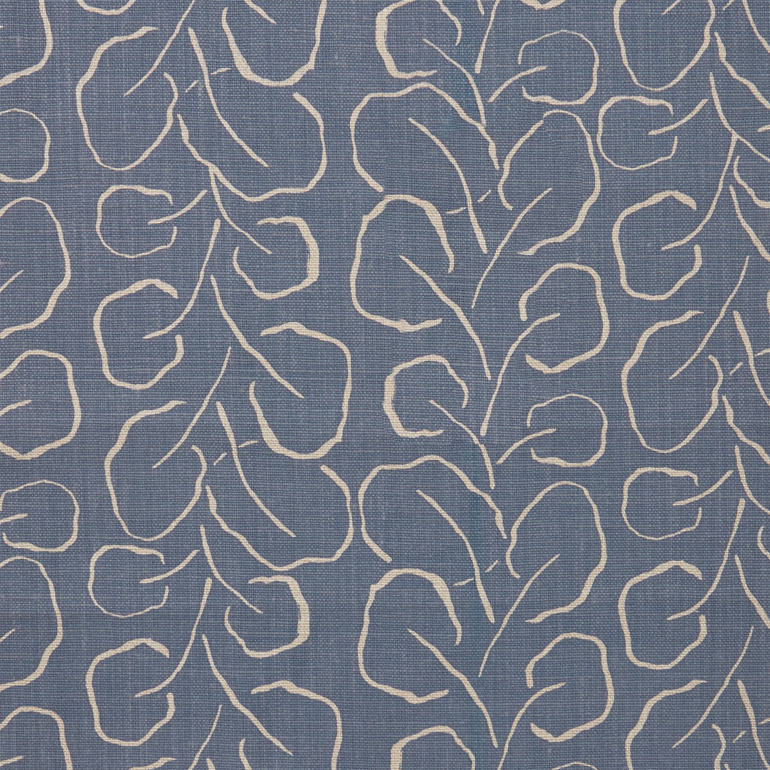 Woven fabric swatch with a large-scale repeating leaf print in tan on a French blue background.