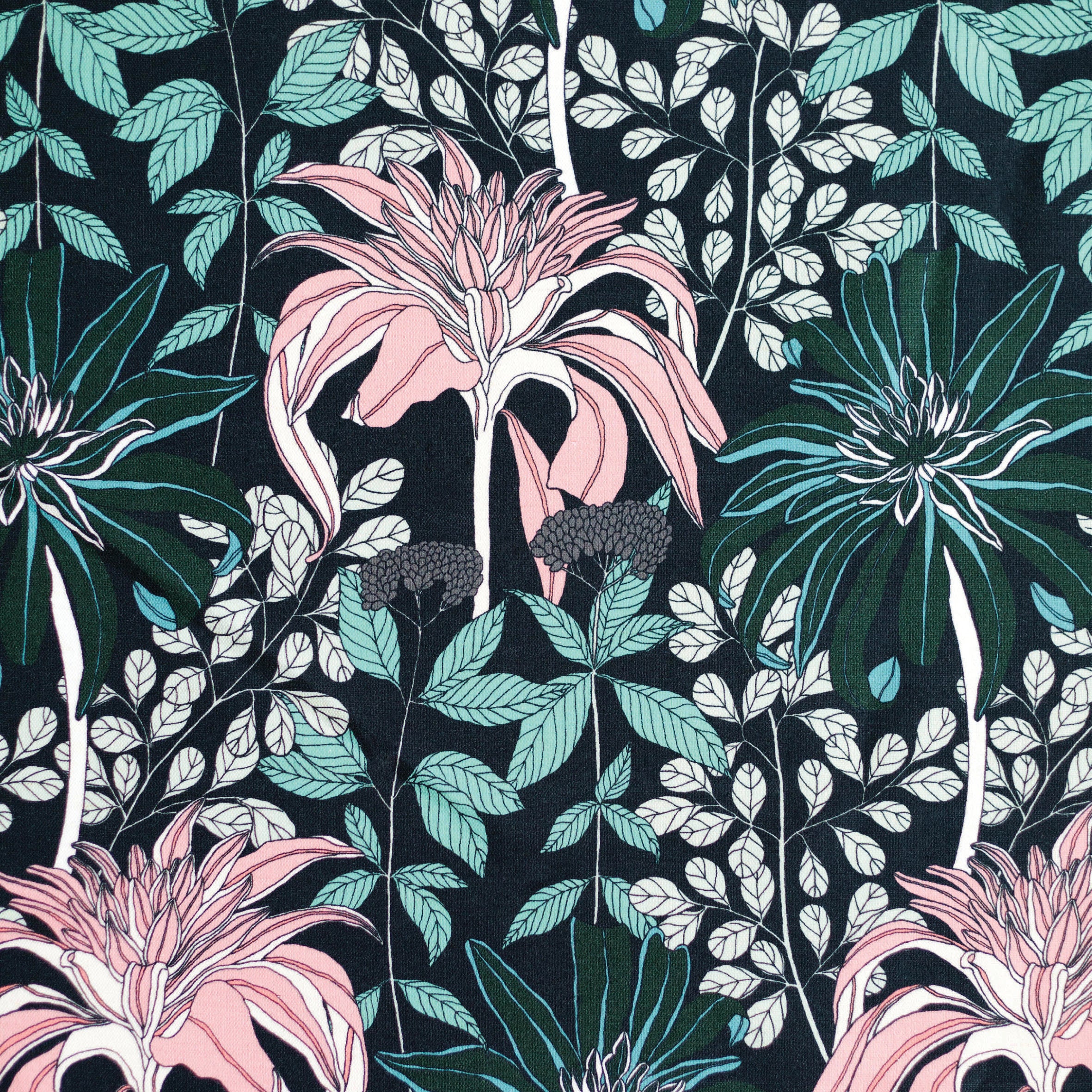 Detail of fabric in a floral print in pink, green and blue on a navy field.