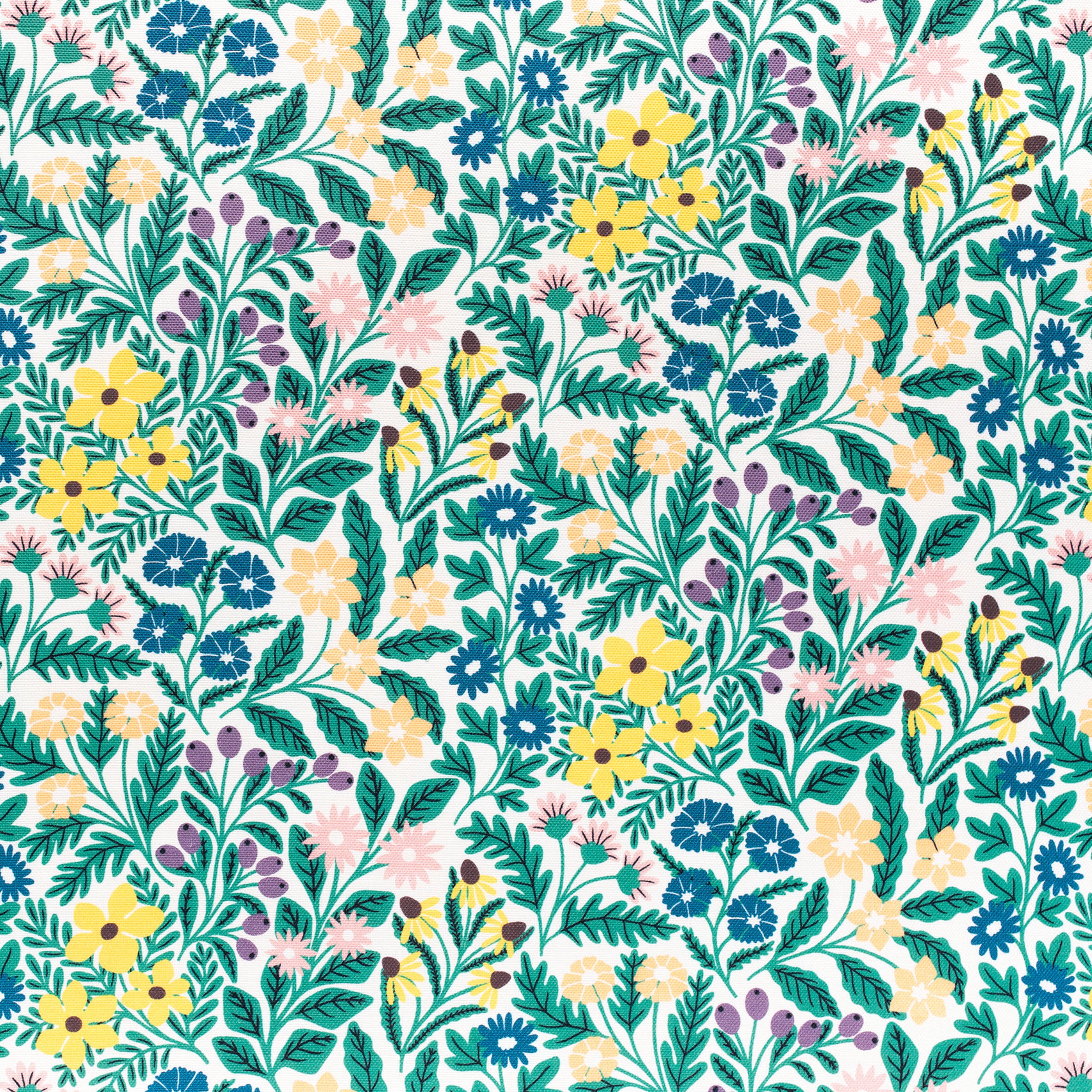 Detail of fabric in a small-scale floral print in green, yellow and pink on a white field.