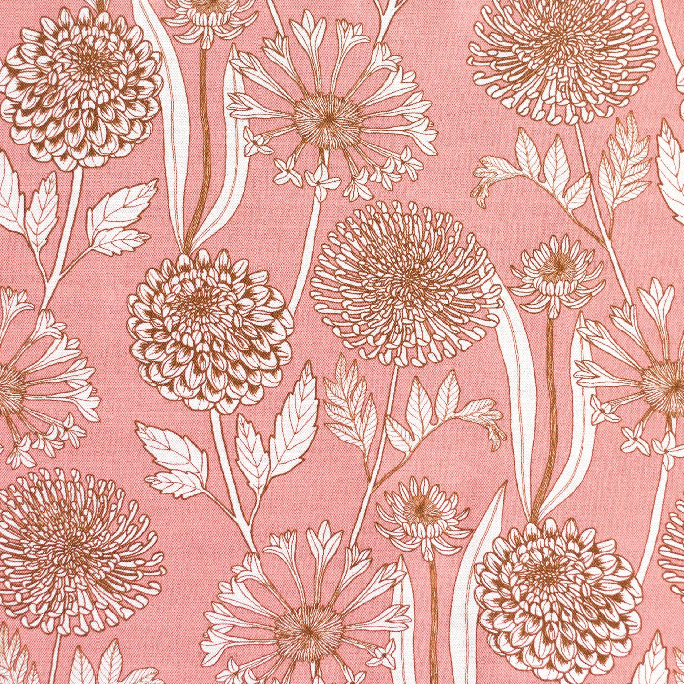 Detail of fabric in a large-scale floral print in orange and white on a light pink field.