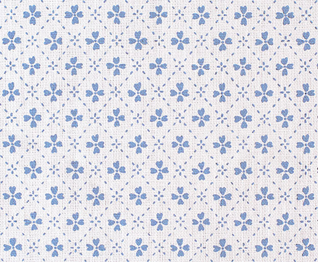 Detail of fabric in a dainty floral lattice print in blue on a white field.