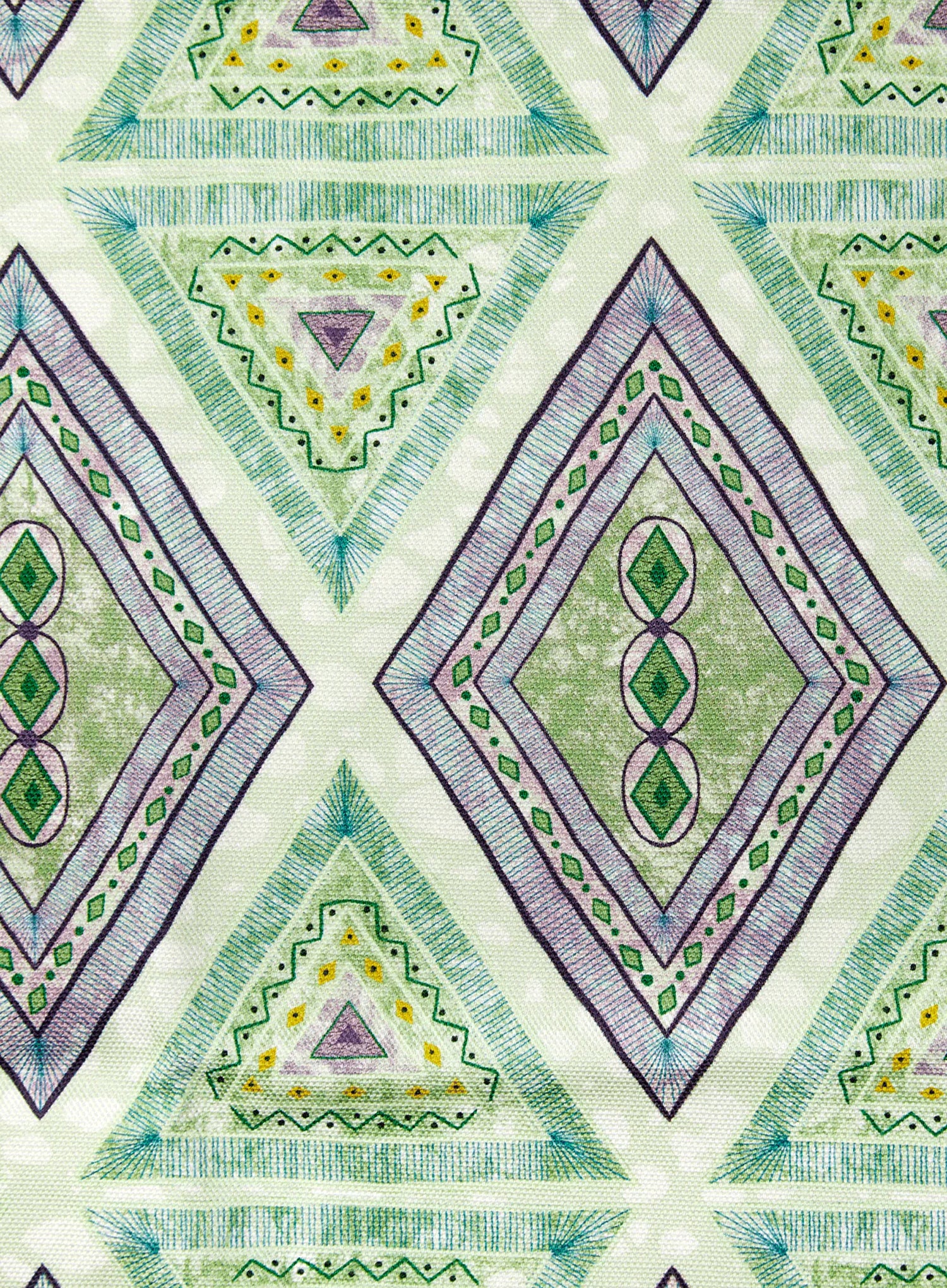 Detail of fabric in an intricate diamond grid pattern in shades of green and purple.
