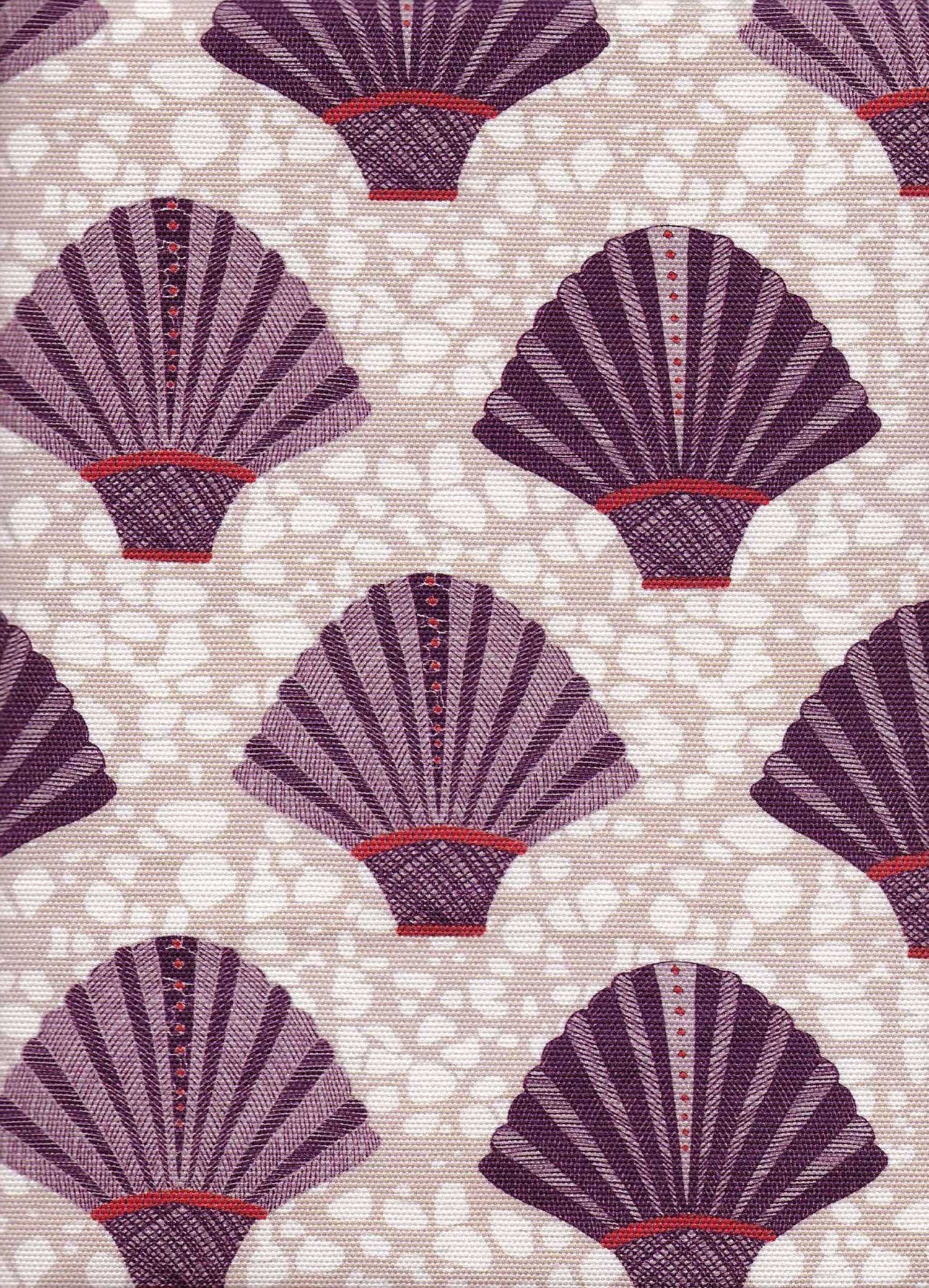 Detail of fabric in a playful fan print in purple and red on a mottled cream field.