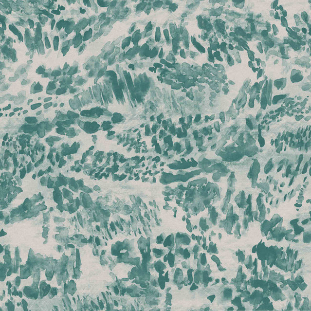 Detail of fabric in a painterly cloud print in shades of turquoise on a cream field.