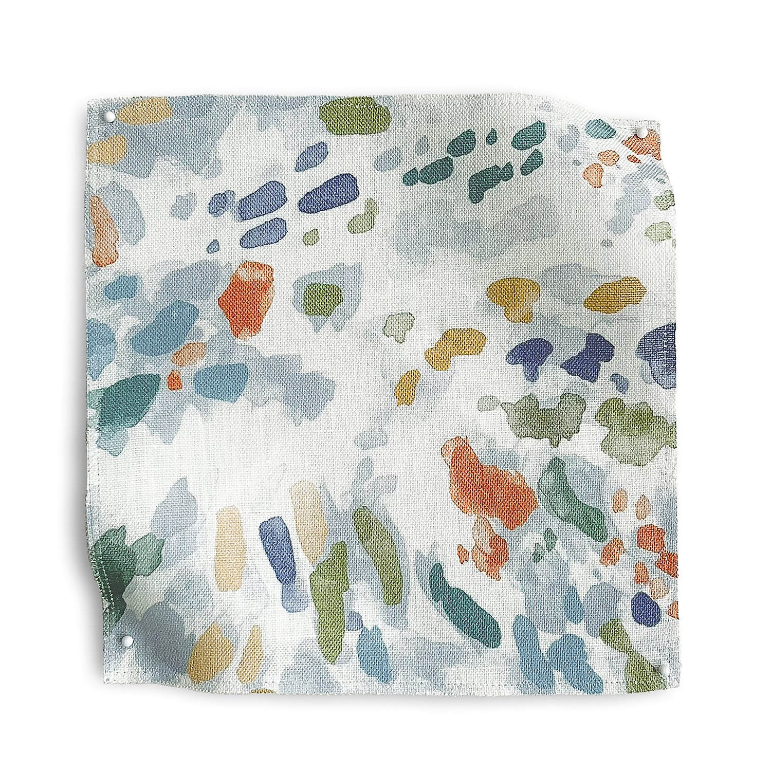 Square fabric swatch in a painterly cloud print in shades of red, green, yellow and blue on a cream field.