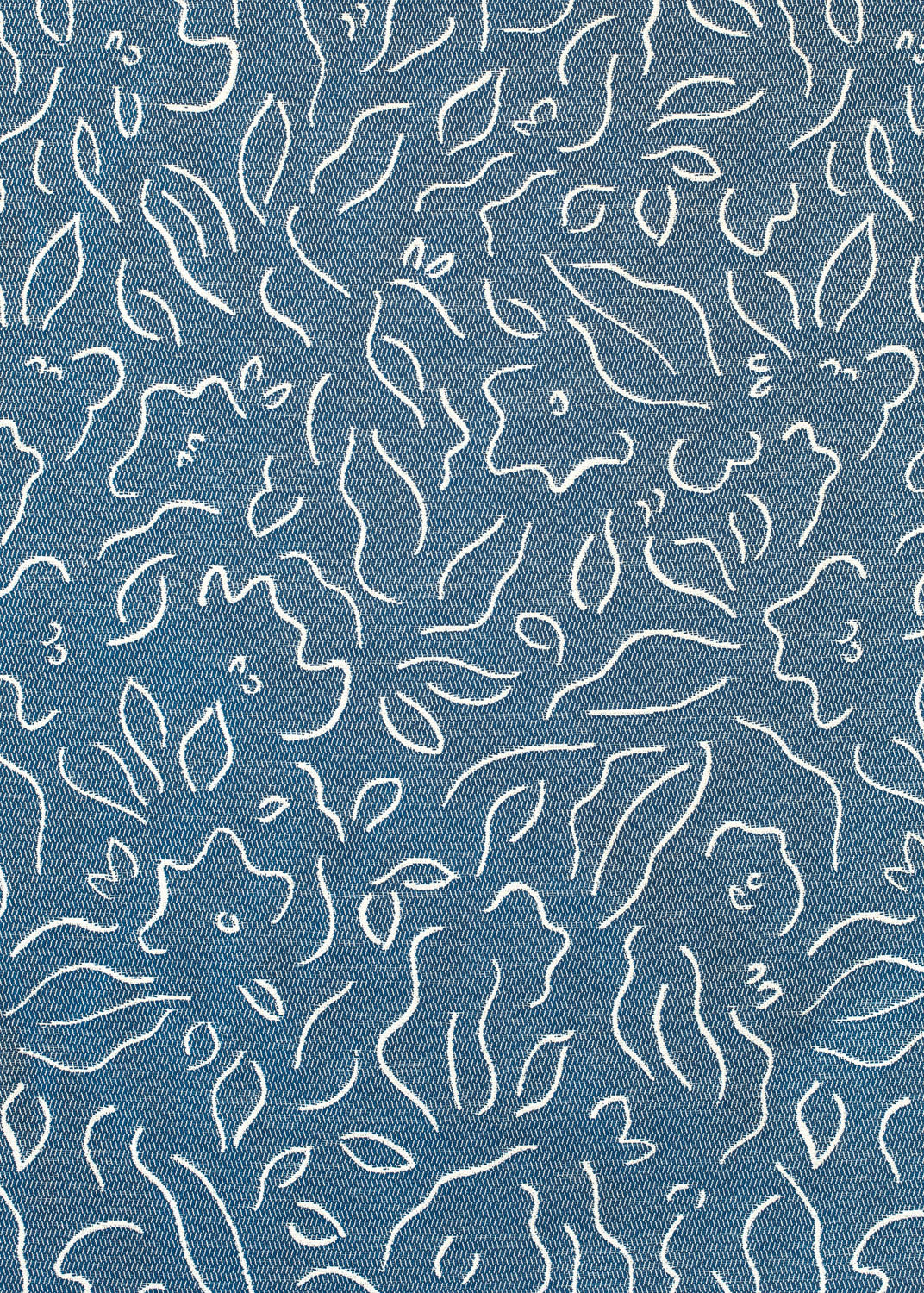 Detail of fabric in a minimalist floral print in cream on a navy field.