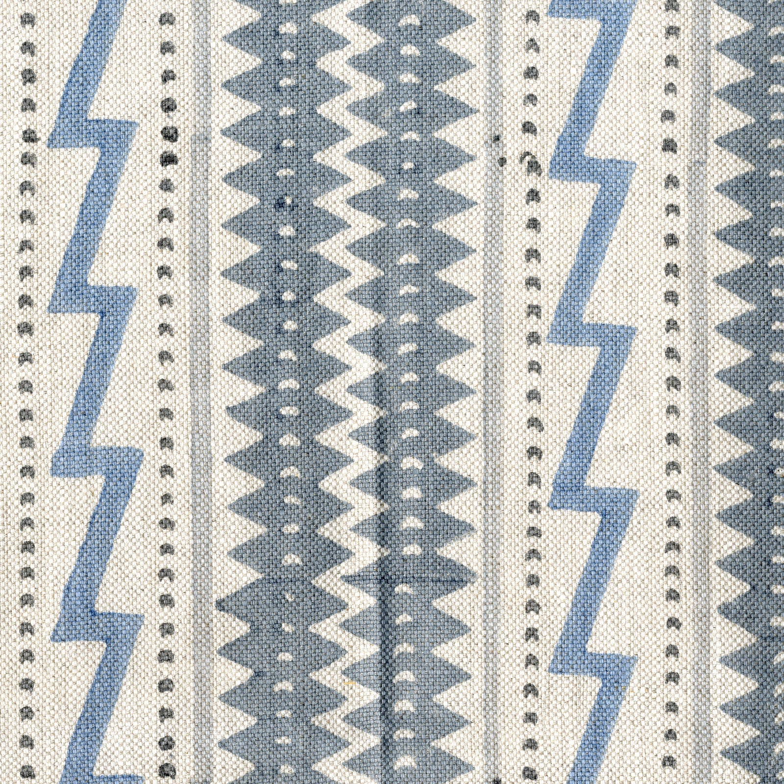 Fabric in a playful stripe and zigzag pattern in shades of gray and blue on a cream field.