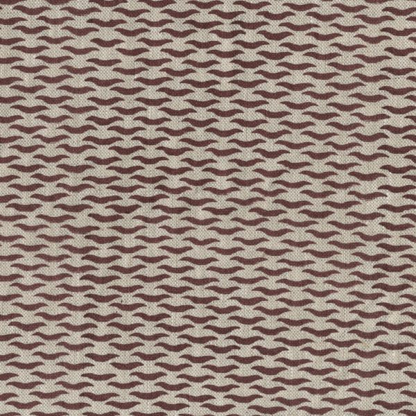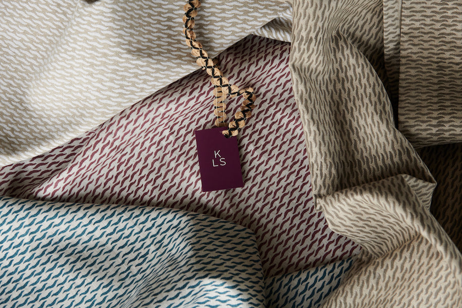 Draped fabrics in repeating abstract prints in various blue, maroon and tan colorways, with a tag labeled "KLS" on top.