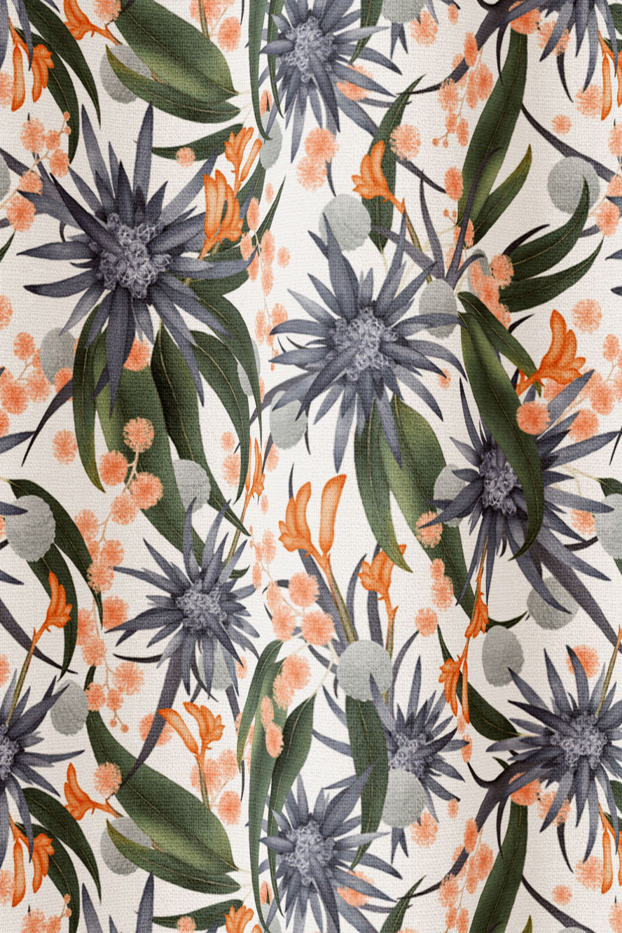 Square fabric swatch in a large-scale botanical print in shades of blue, green and coral on a cream field.