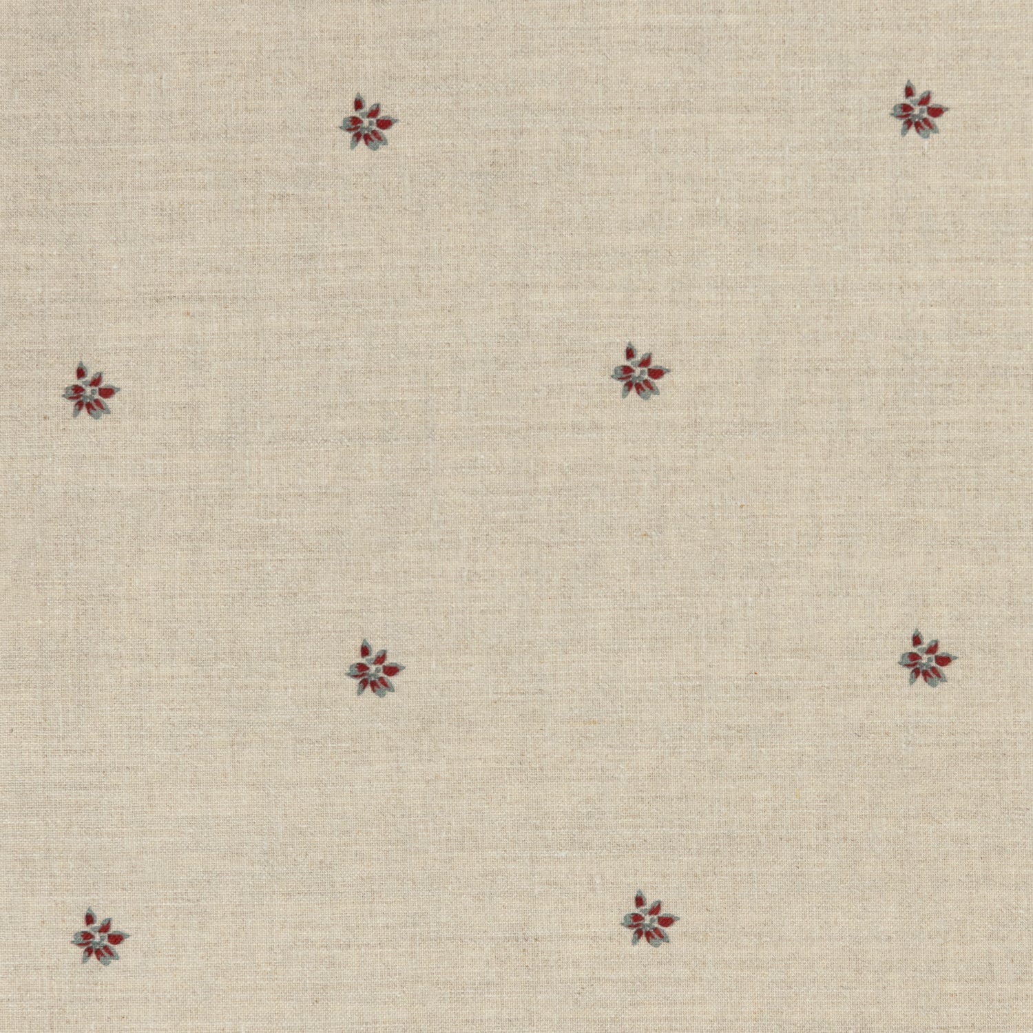 Printed linen fabric in a repeating small-scale flower pattern in red and gray on a cream field.
