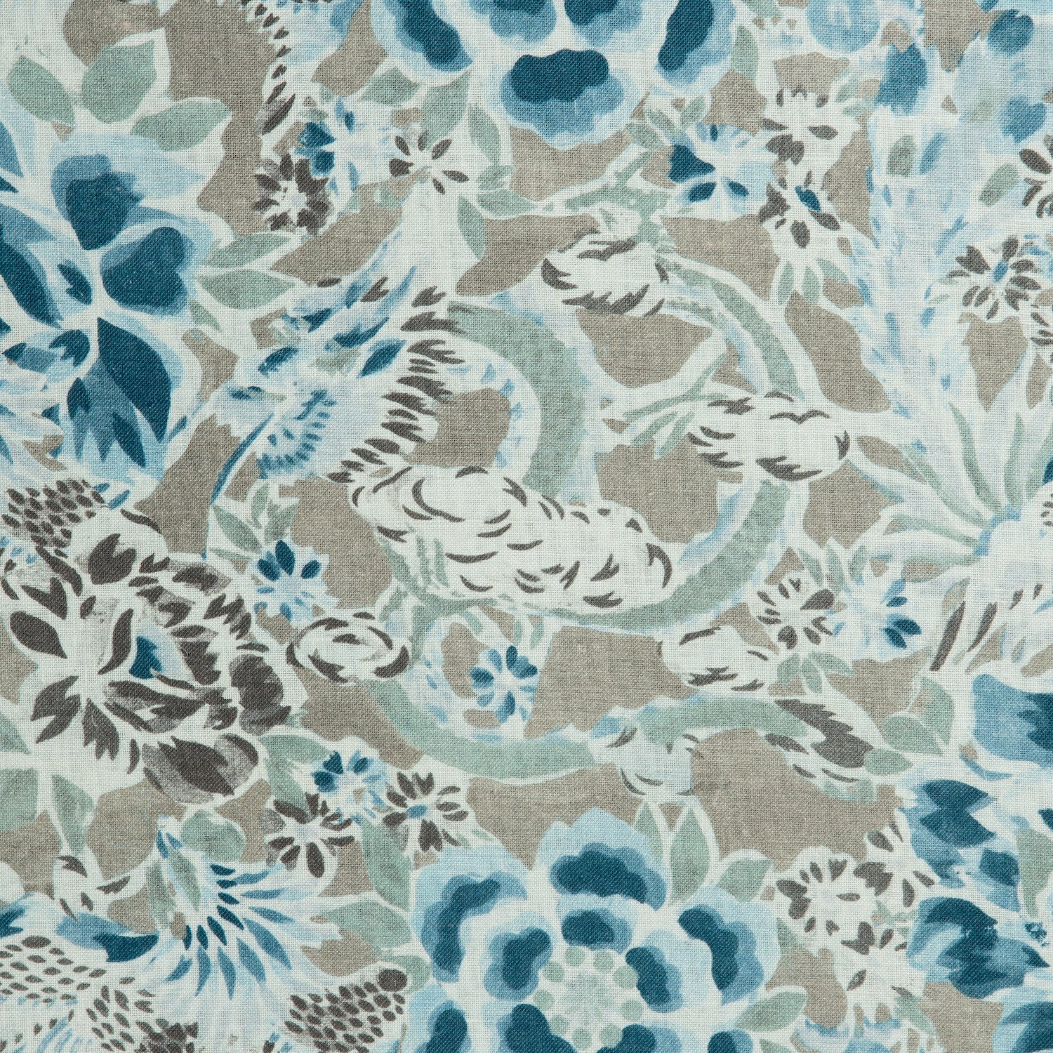 Detail of a linen fabric in a painterly floral pattern in shades of blue and brown on a greige field.