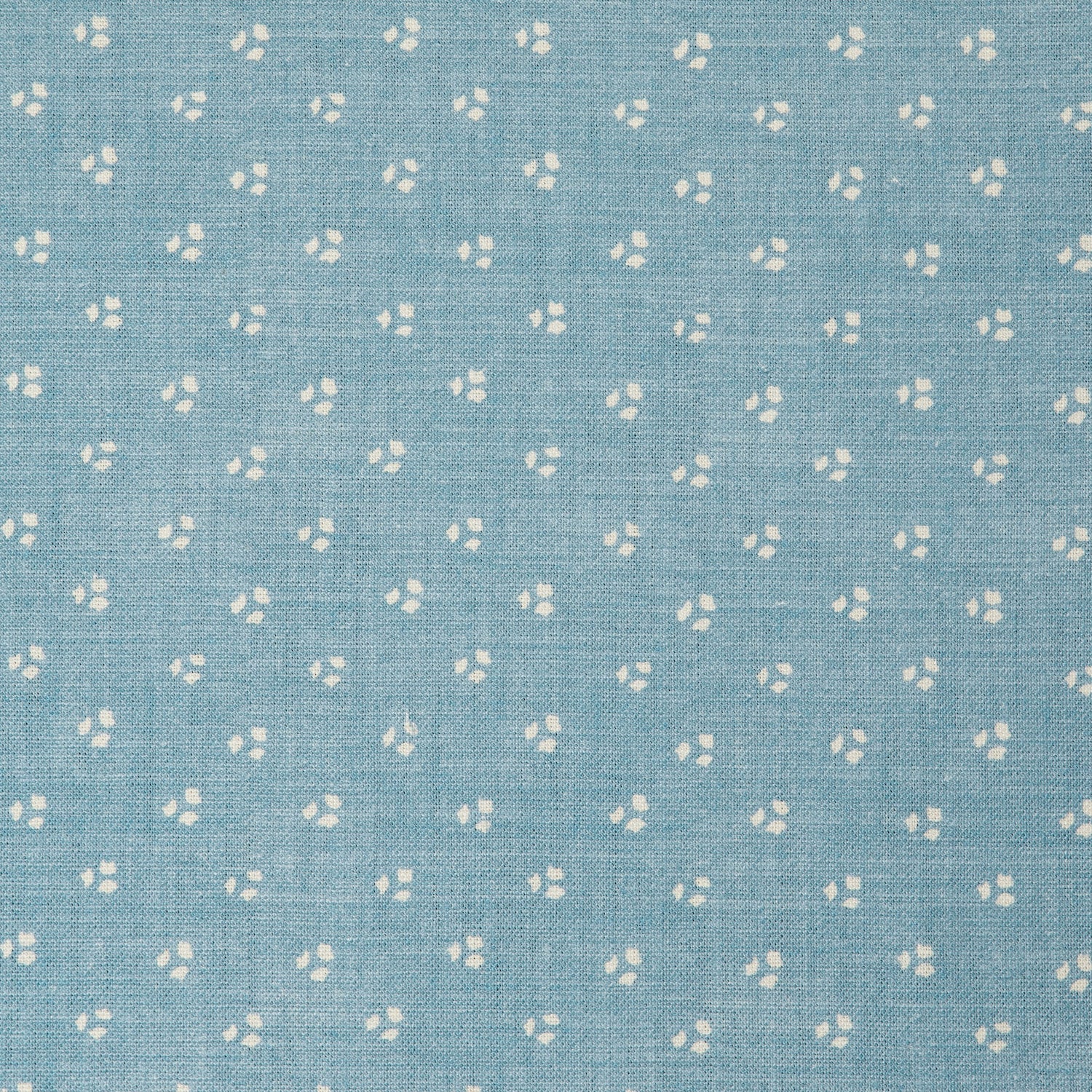Detail of a linen fabric in a clustered dot pattern in cream on a sky blue field.