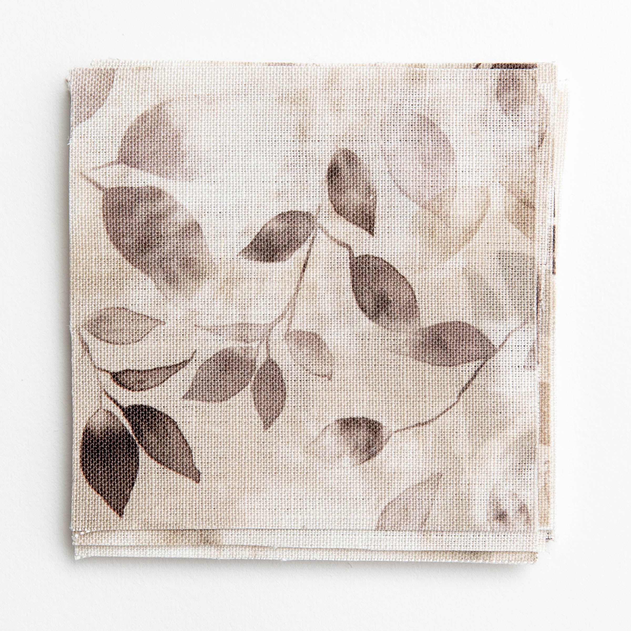 A stack of fabric swatches in a painterly leaf print in shades of tan and purple with a mottled white overlay.