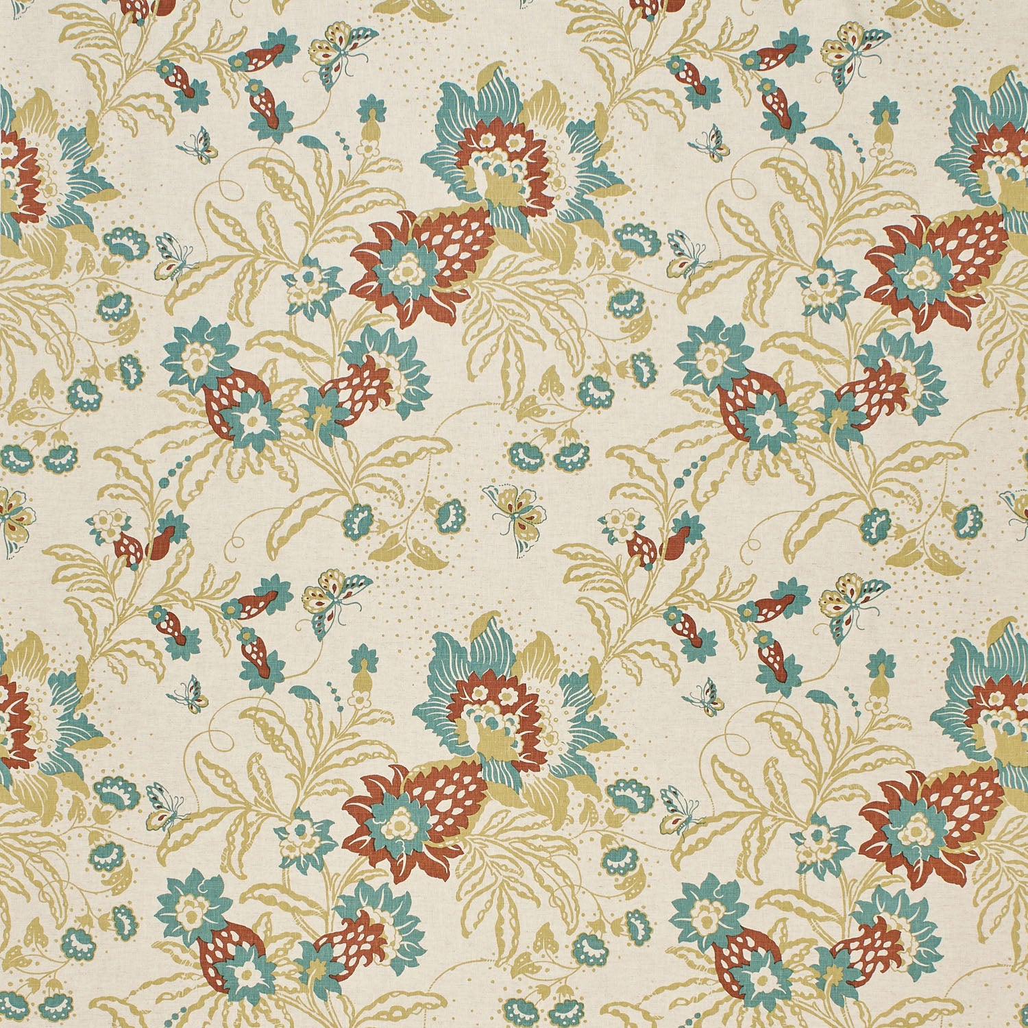 Printed fabric detail in a scrolling botanical print in tan, turquoise and burnt sienna.