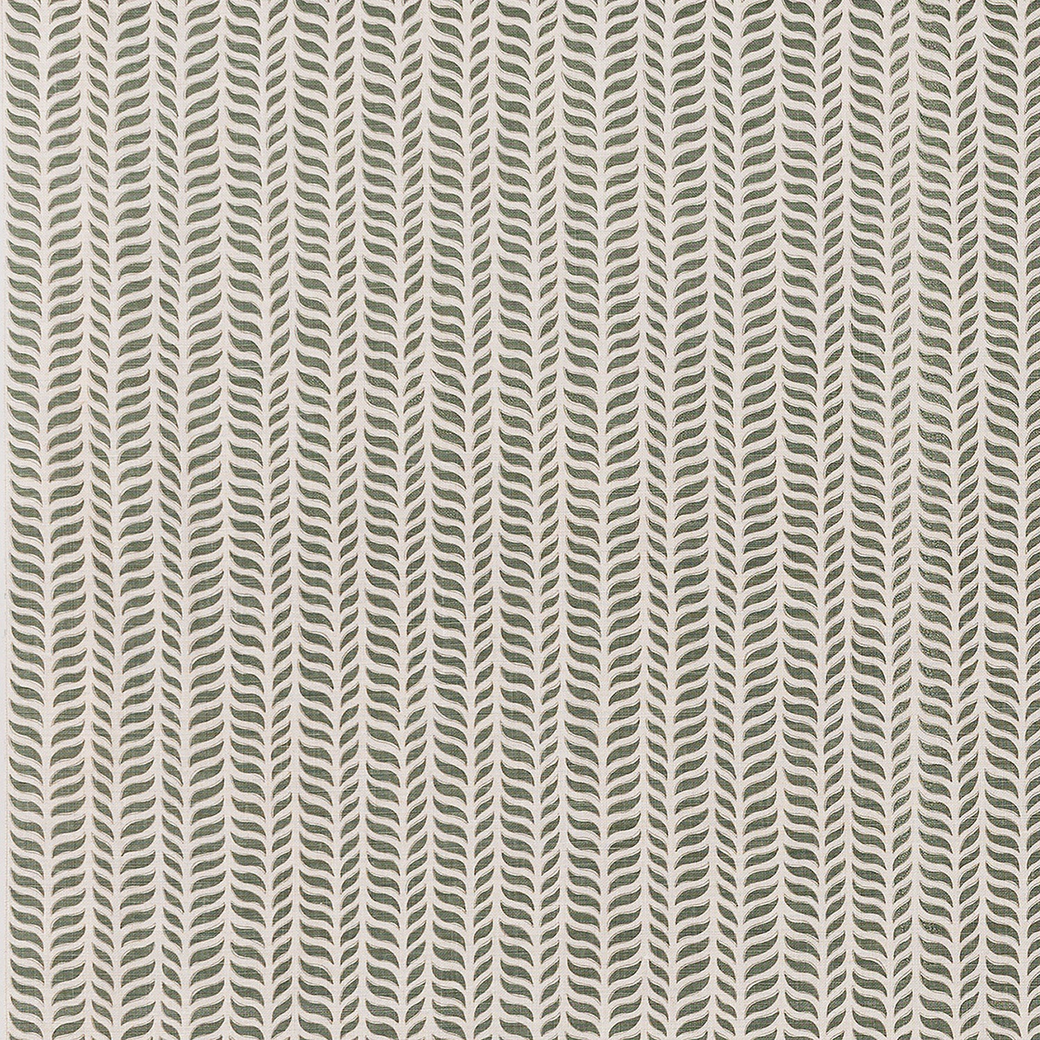 Fabric in a painterly herringbone print in green and brown on a cream field.