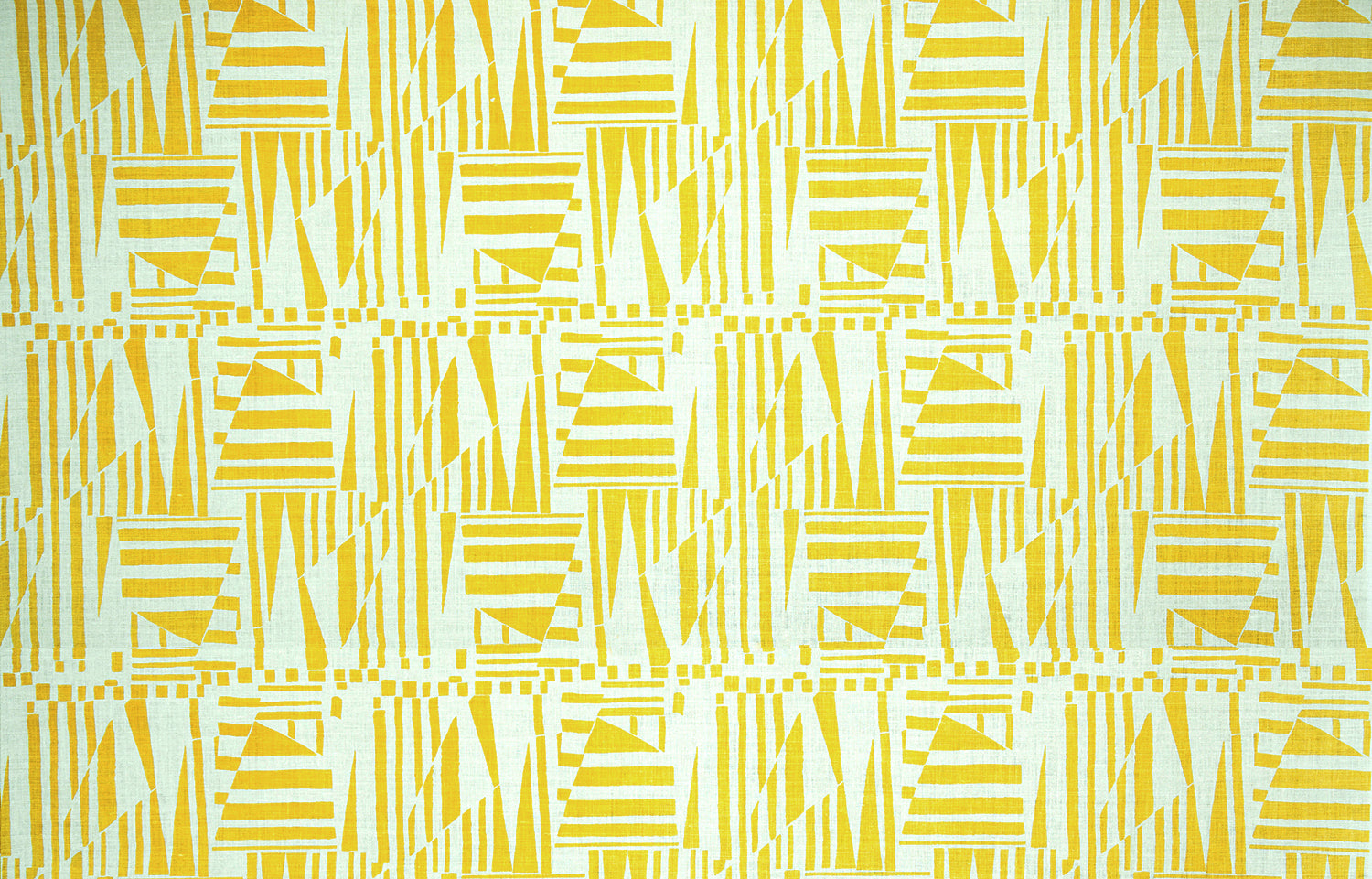 Detail of fabric in a dense geometric print in yellow on a white field.