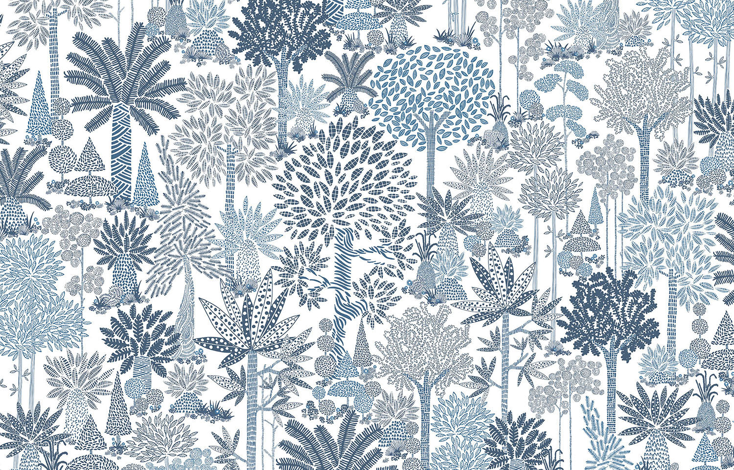 Detail of fabric in a playful tree print in blue and navy on a white field.