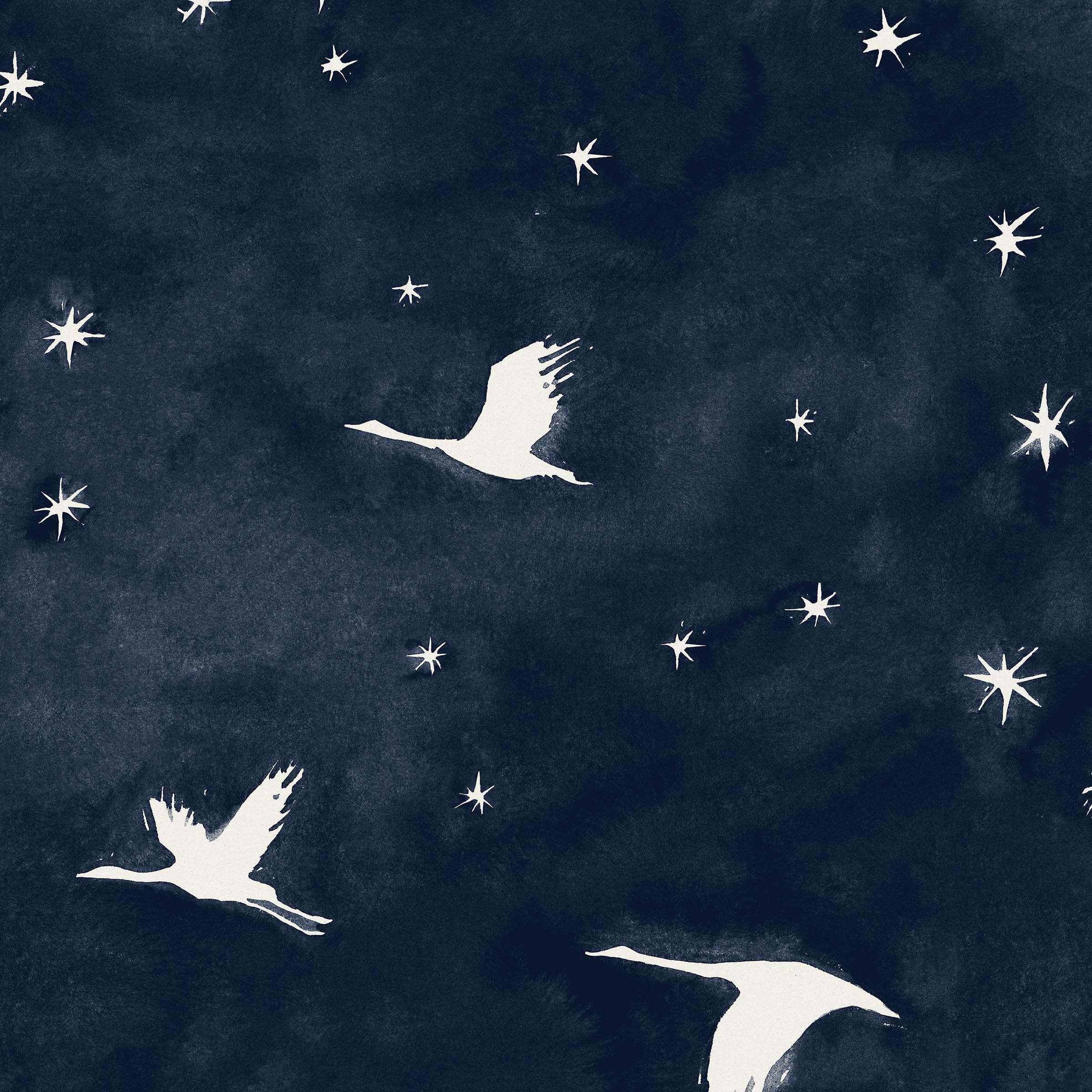 Detail of wallpaper in a repeating print of birds and stars in white on a navy watercolor field.
