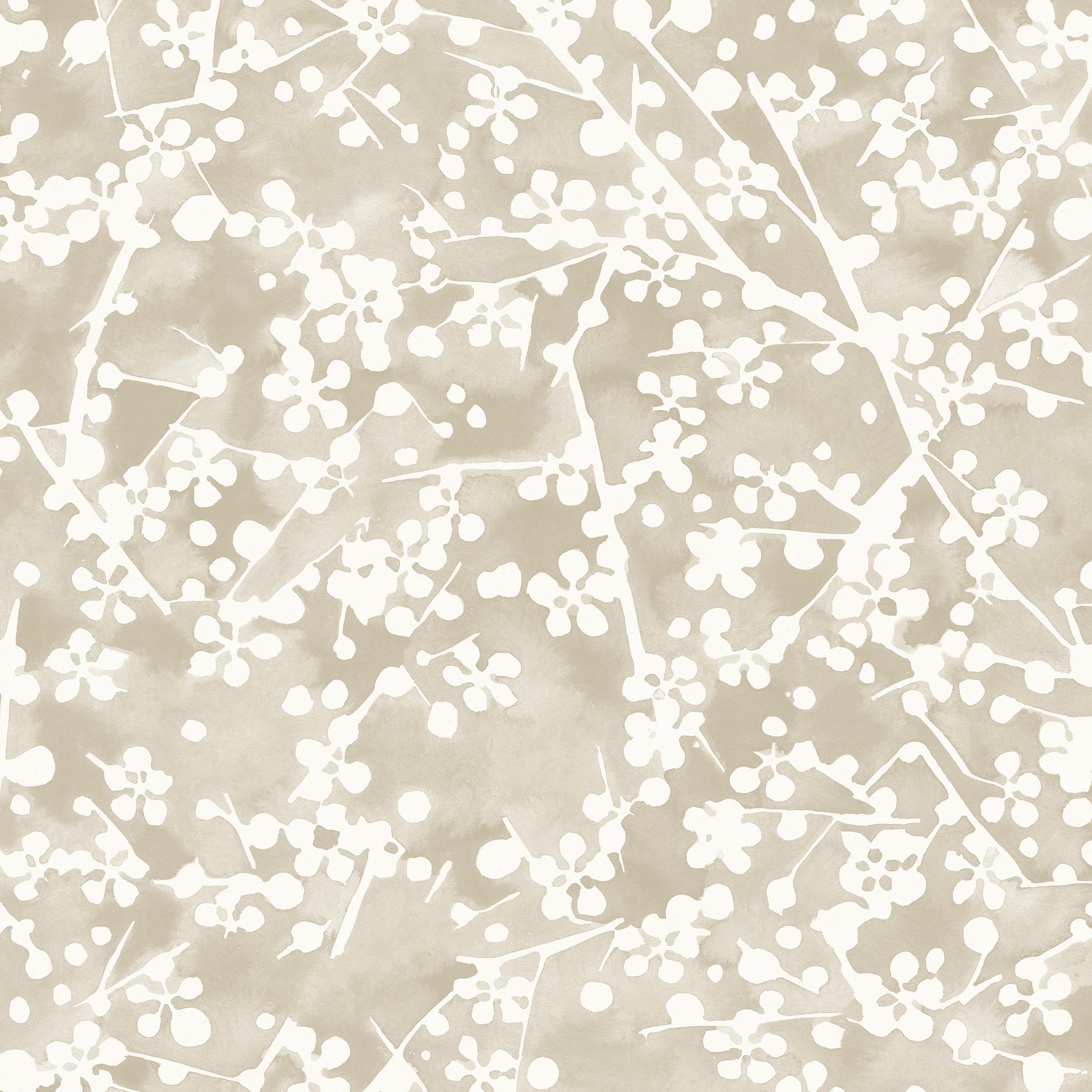 Detail of wallpaper in a painterly branch print in white on a taupe watercolor field.