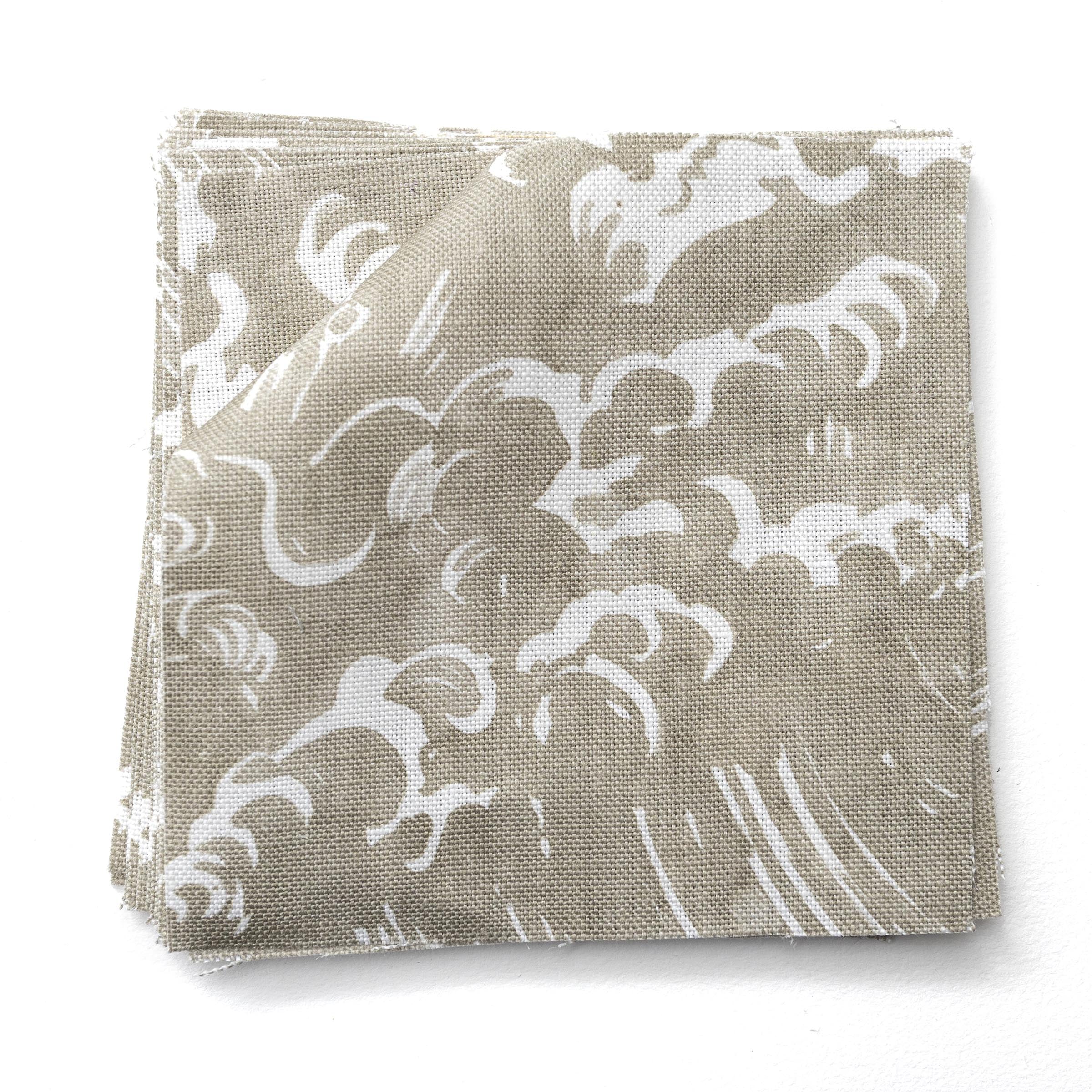 Fabric swatches in a playful wave print in white on a pale grey-green watercolor field.