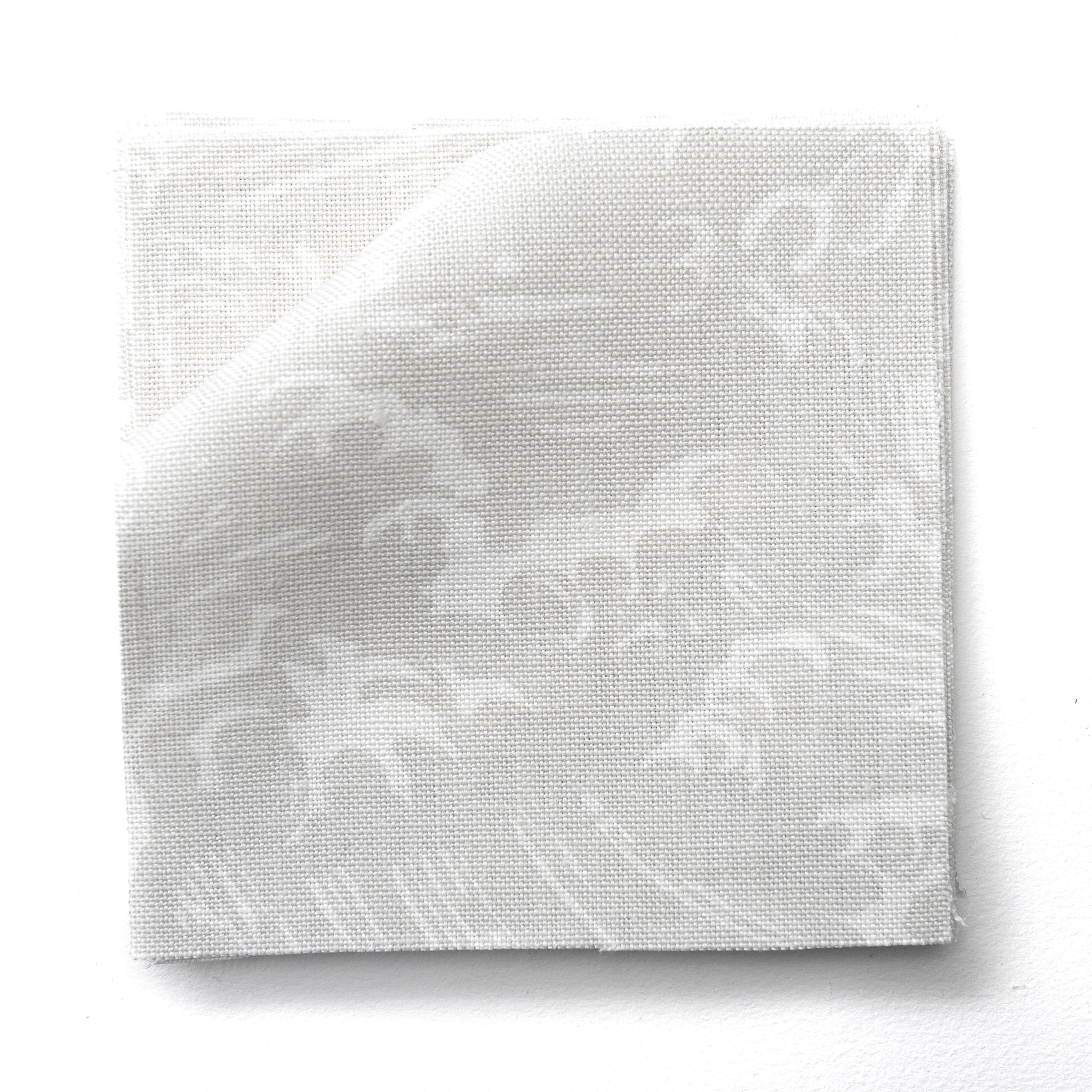 Draped linen in in a playful wave print in white on a pale grey watercolor field.