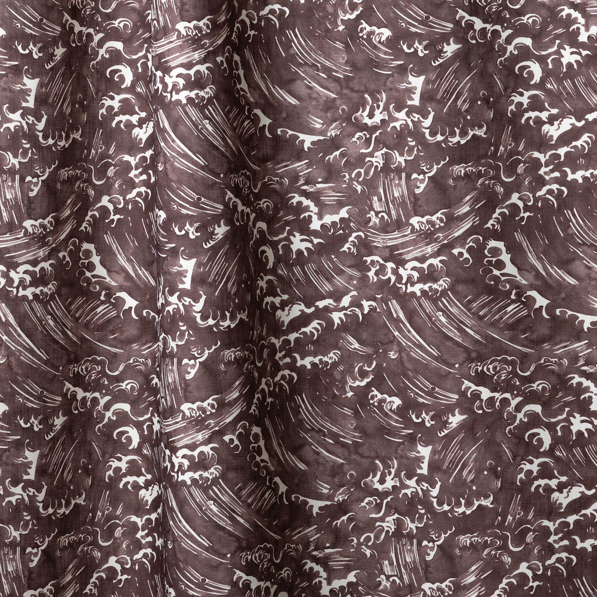 Fabric swatches in a playful wave print in white on a warm dark grey watercolor field.