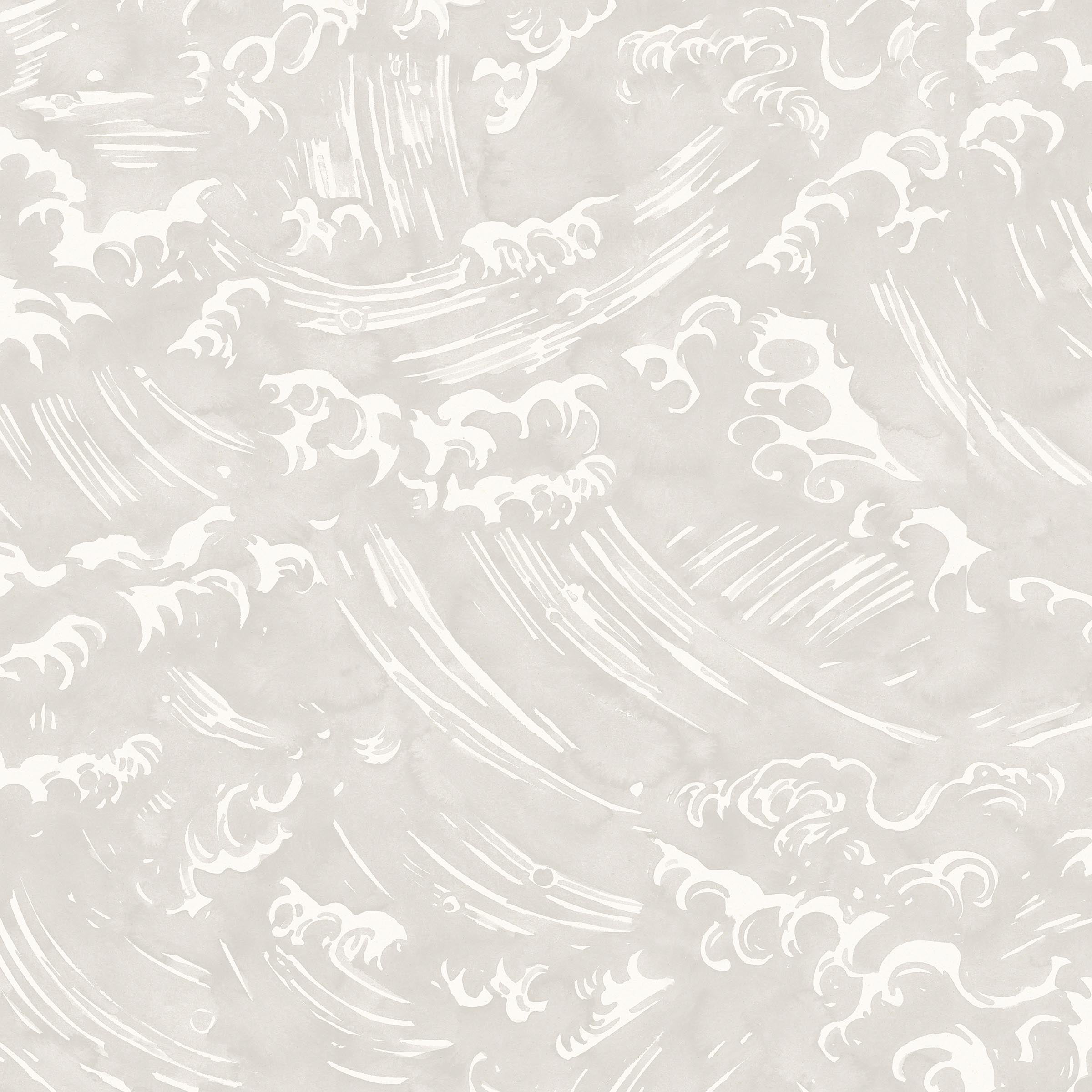 Detail of wallpaper in a playful wave print in white on a pale grey watercolor field.