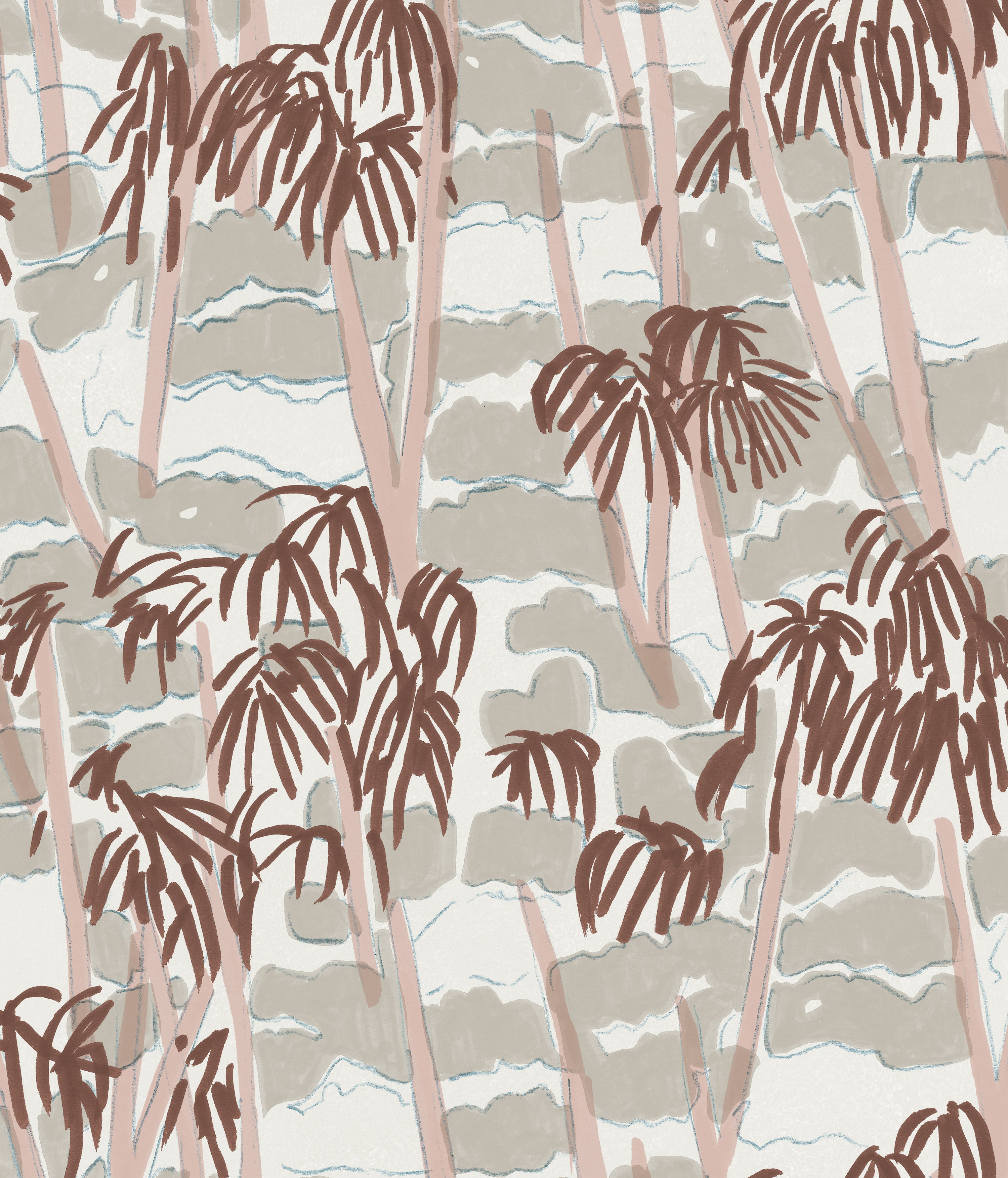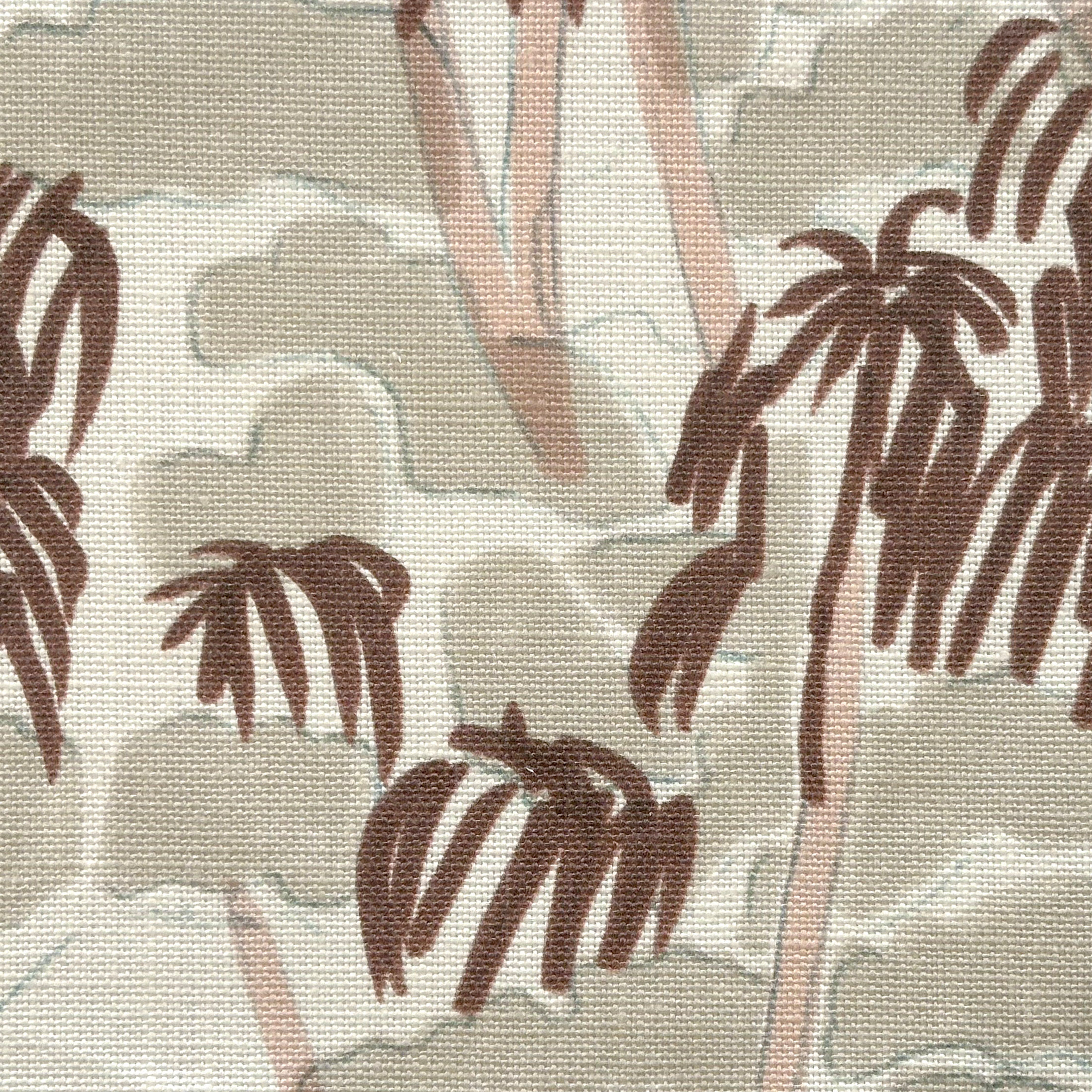 Detail of fabric in a painterly palm tree print in shades of pink, brown and blue on a white field.