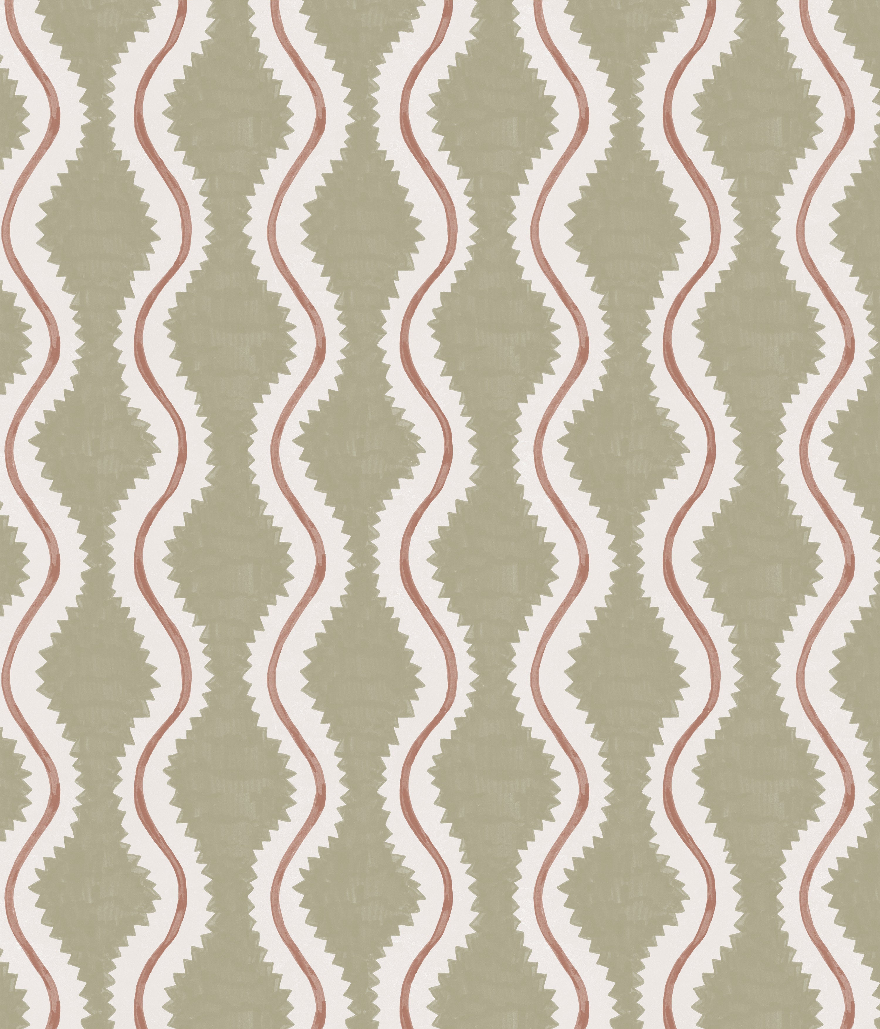 Detail of fabric in a playful curvy stripe print in white and brown on an olive field.