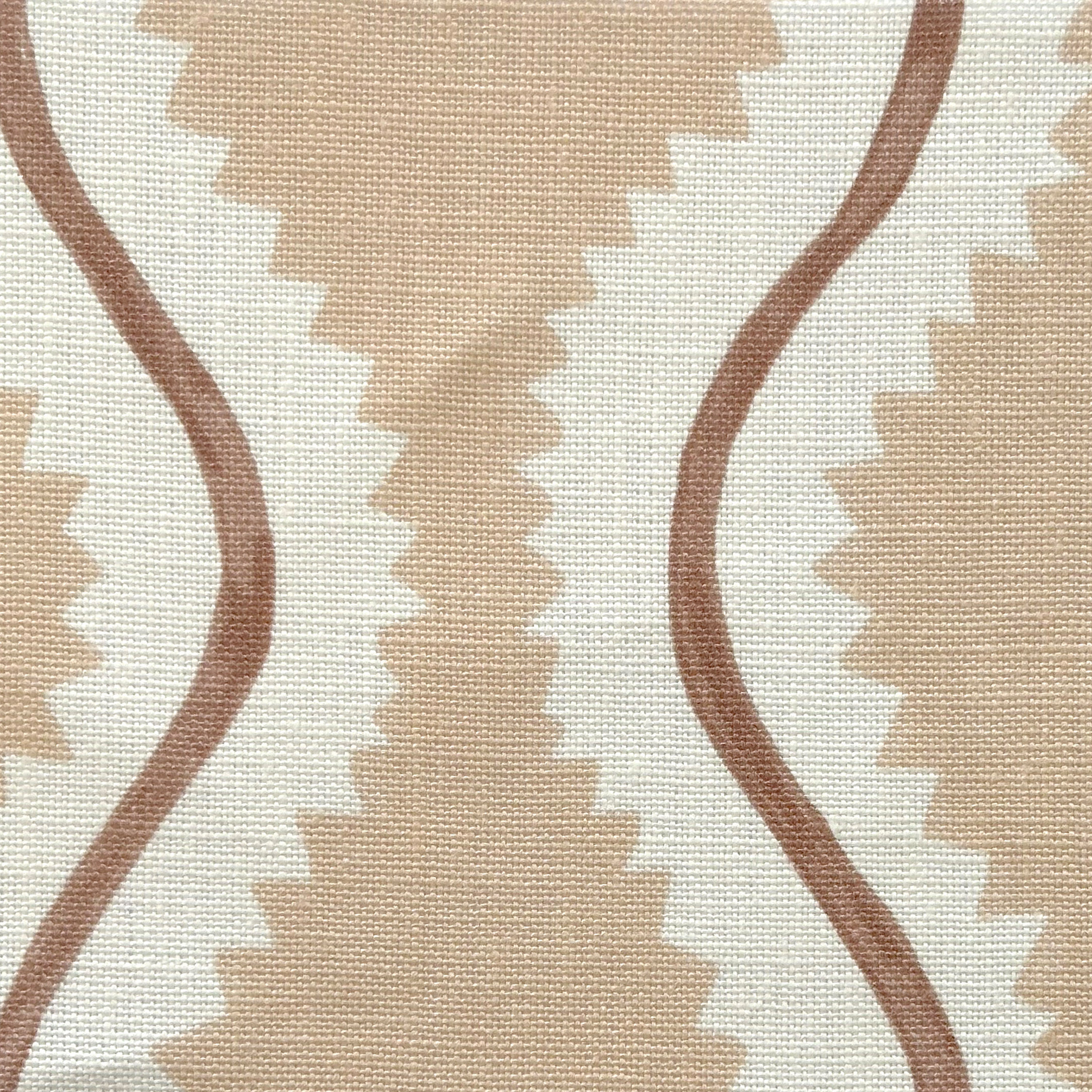 Detail of fabric in a playful curvy stripe print in white and brown on a light pink field.