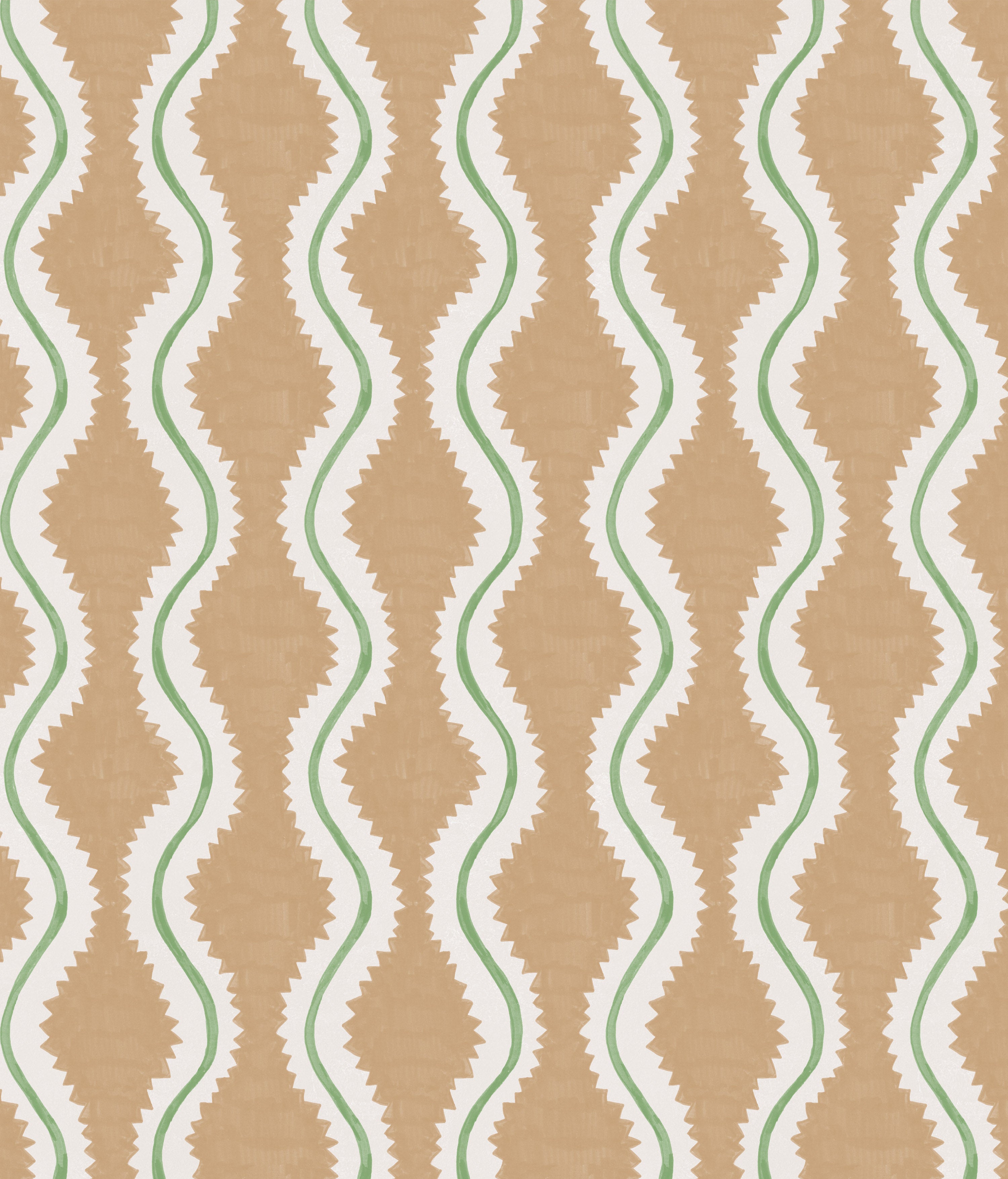 Close-up of fabric in a playful curvy stripe print in white and green on a burnt orange field.