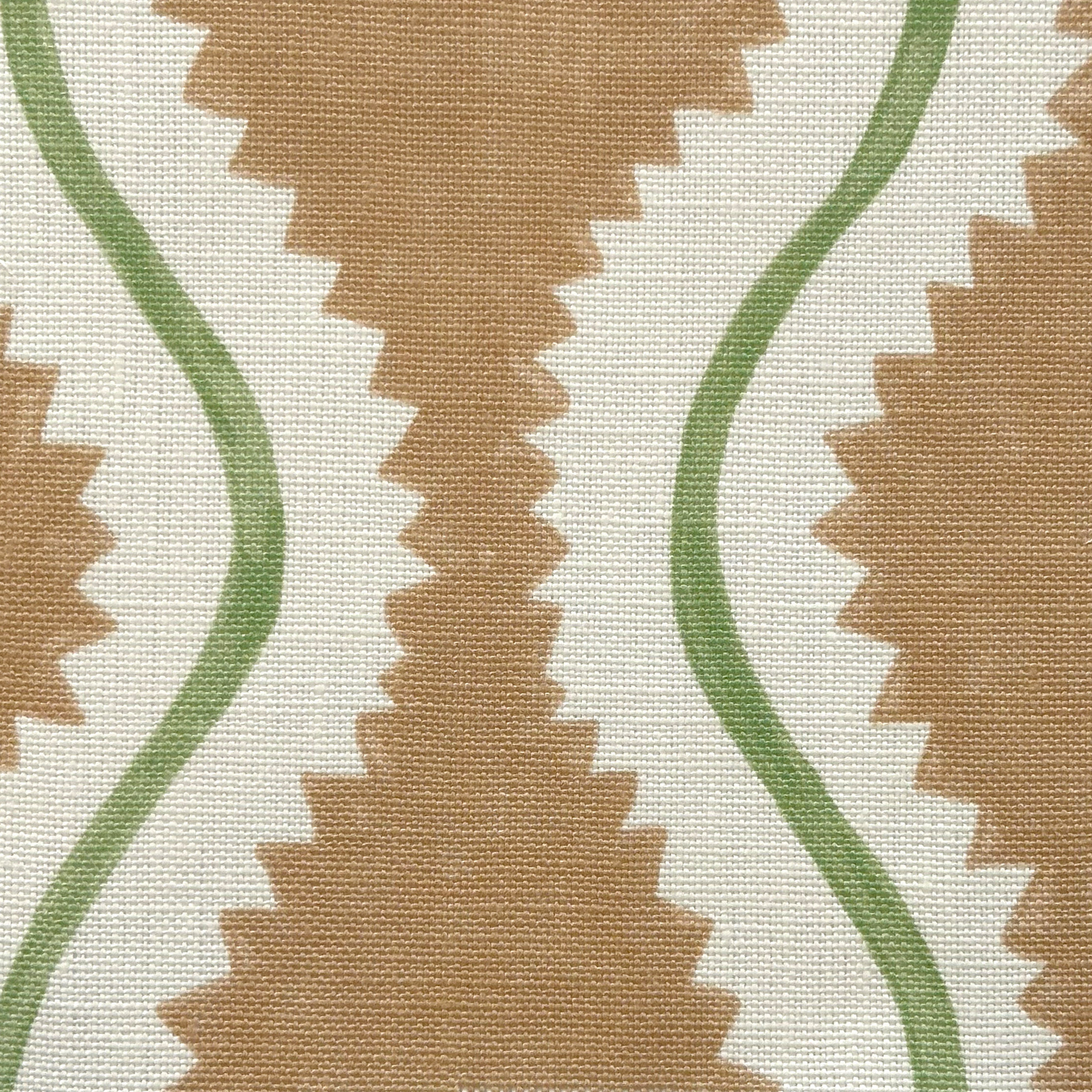 Detail of fabric in a playful curvy stripe print in white and green on a burnt orange field.